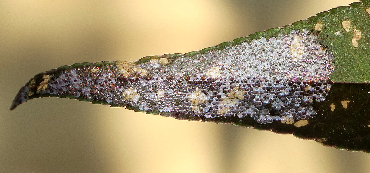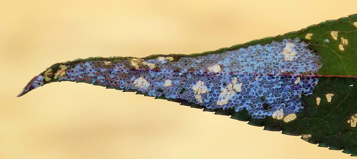 Man sieht die zahlreichen leeren Eihüllen; die dunkel braunen (v. a. links) sind vielleicht parasitiert, oder sie haben sich nicht entwickelt. Die hellen Flecken im Blatt, unter und rechts im Bild,