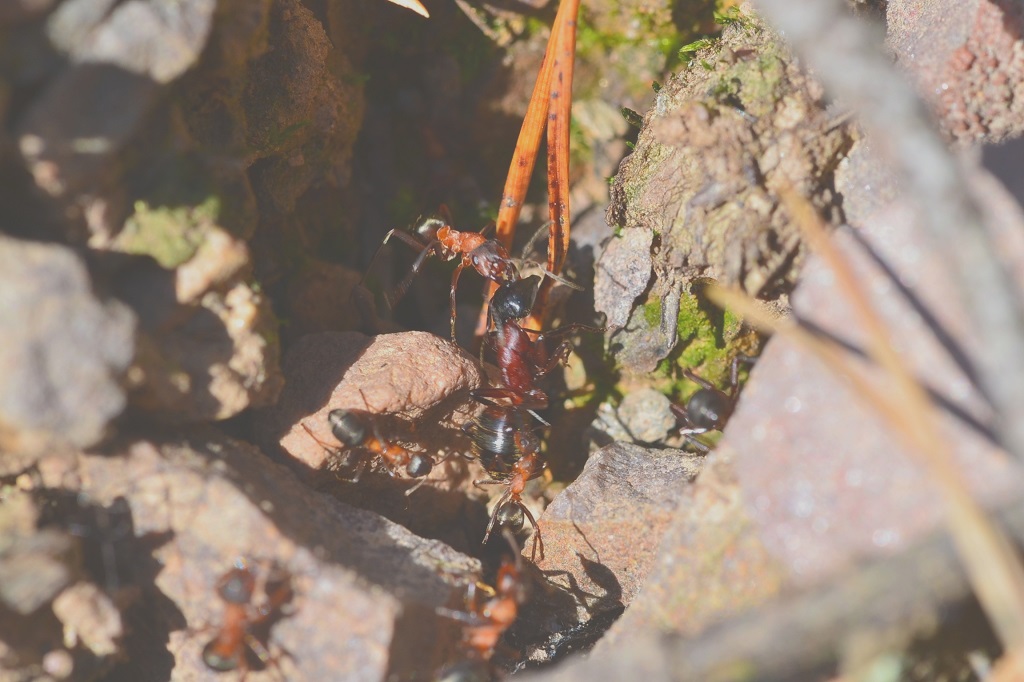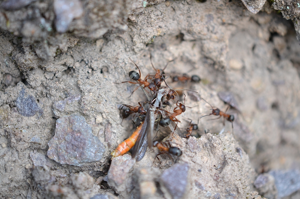 Auffällig fand ich die Unteschiede in der Färbung. Ich habe diese Art bereits gehalten und während "meine" Arbeiterinnen eher dunkelrot gefärbt waren geht die Färbung hier im Freiland eher in die Richtung orange-warnrot. Gibt es bei der Pigmentierung (Mesosoma und Kopf) tatsächlich so große regionale Unterschiede oder liegt das nur an der Belichtung ?