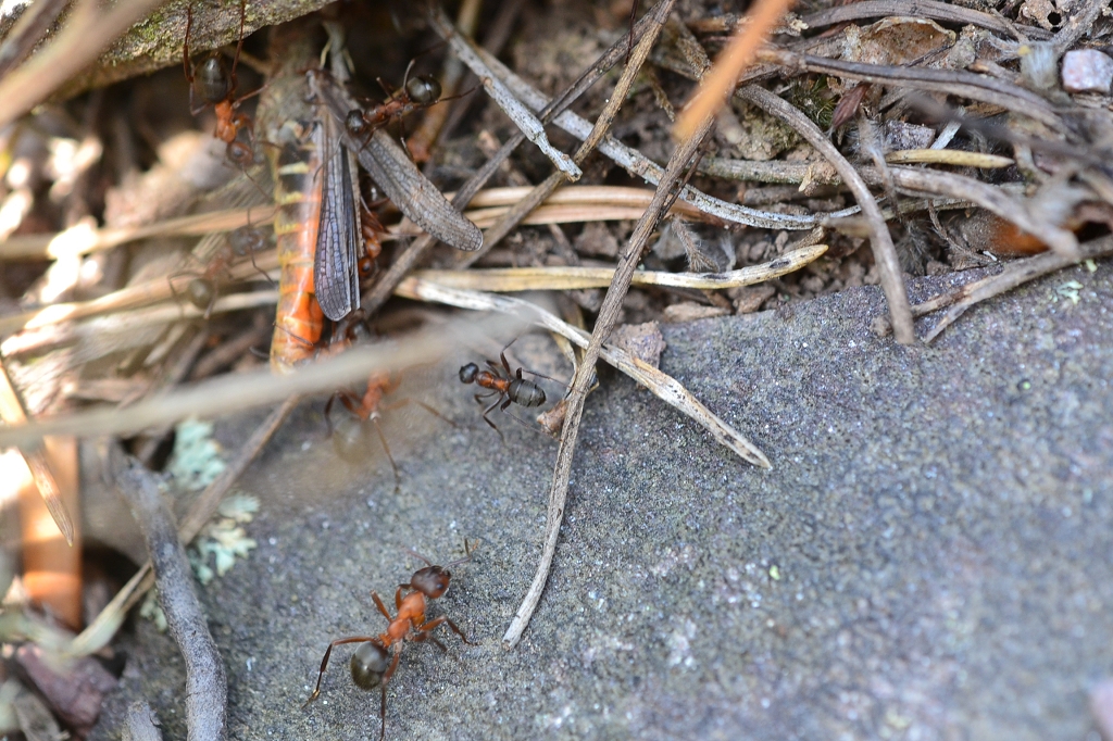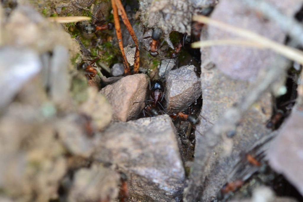 Das Kapitel des außergewöhnlichen Neststandorts von Formica s. str. will ich abschließen. Vor ein paar Tagen habe ich das Gebiet nochmal besucht. Von den Ameisen keine Spur- das alte Nest und auch der neuere Standort sind verlassen. Ich habe den weiteren Umkreis abgesucht und keine Arbeiterinnen mehr gefunden. An beiden Nestern habe ich keine tote Ameisen gefunden.