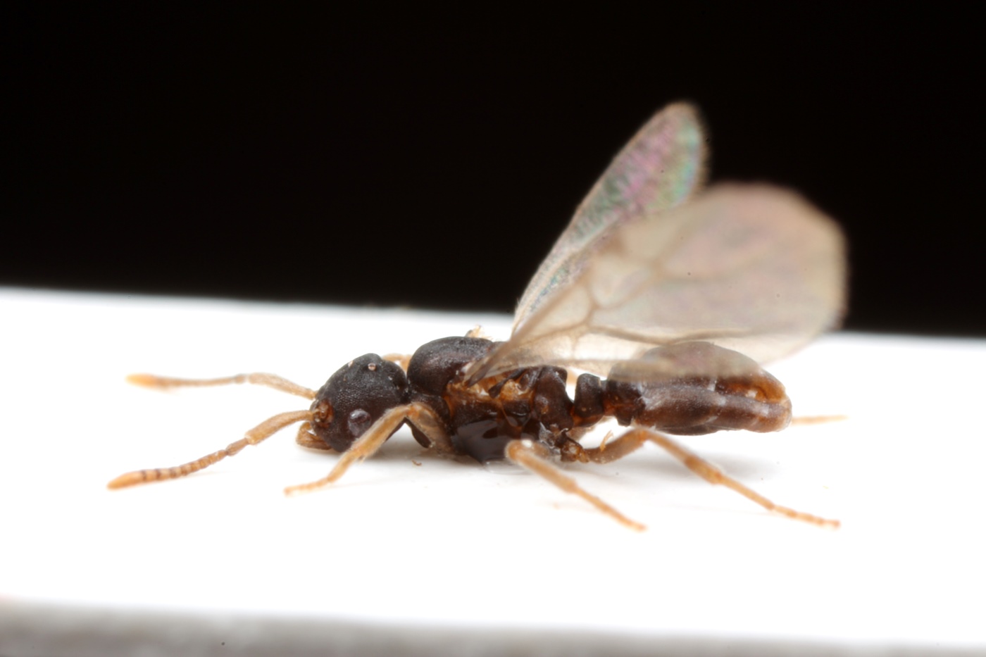 Wieder wurde eine alate Gyne v. Anergates atratulus gefunden, inzwischen hat sie die Flügel abgebrochen. Sohn Roman hat versucht, das lebende Insekt zu fotografieren. Sehr schwierig, einerseits ist die Tier nur 2,5 mm lang und andererseits erwies es sich als recht lebendig und hat nicht eine Sekunde still gehalten. Auch mit einem Tröpfchen Wasser oder Honig konnte sie nicht zum Verweilen veranlasst werden. Ihr Instinkt treibt sie vorwärts, sie muss unbedingt ein Wirtsnest von Tetramorium sp. finden, ob es wirklich nur ein weisellsoses Nest sein kann, erscheint mir nicht klar: Wie hoch kann der Anteil weiselloser Tetramorium-Nester überhaupt sein? Ein Nest von 100 vielleicht? Das ist sicher noch nicht untersucht worden, aber wenn tatsächlich ein weiselloses Nest Bedingung für eine erfolgreiche Nestgründung sein sollte, würde sich die Erfolgsquote extrem verringern, ich vermute auf fast 0. Kaum vorstellbar!