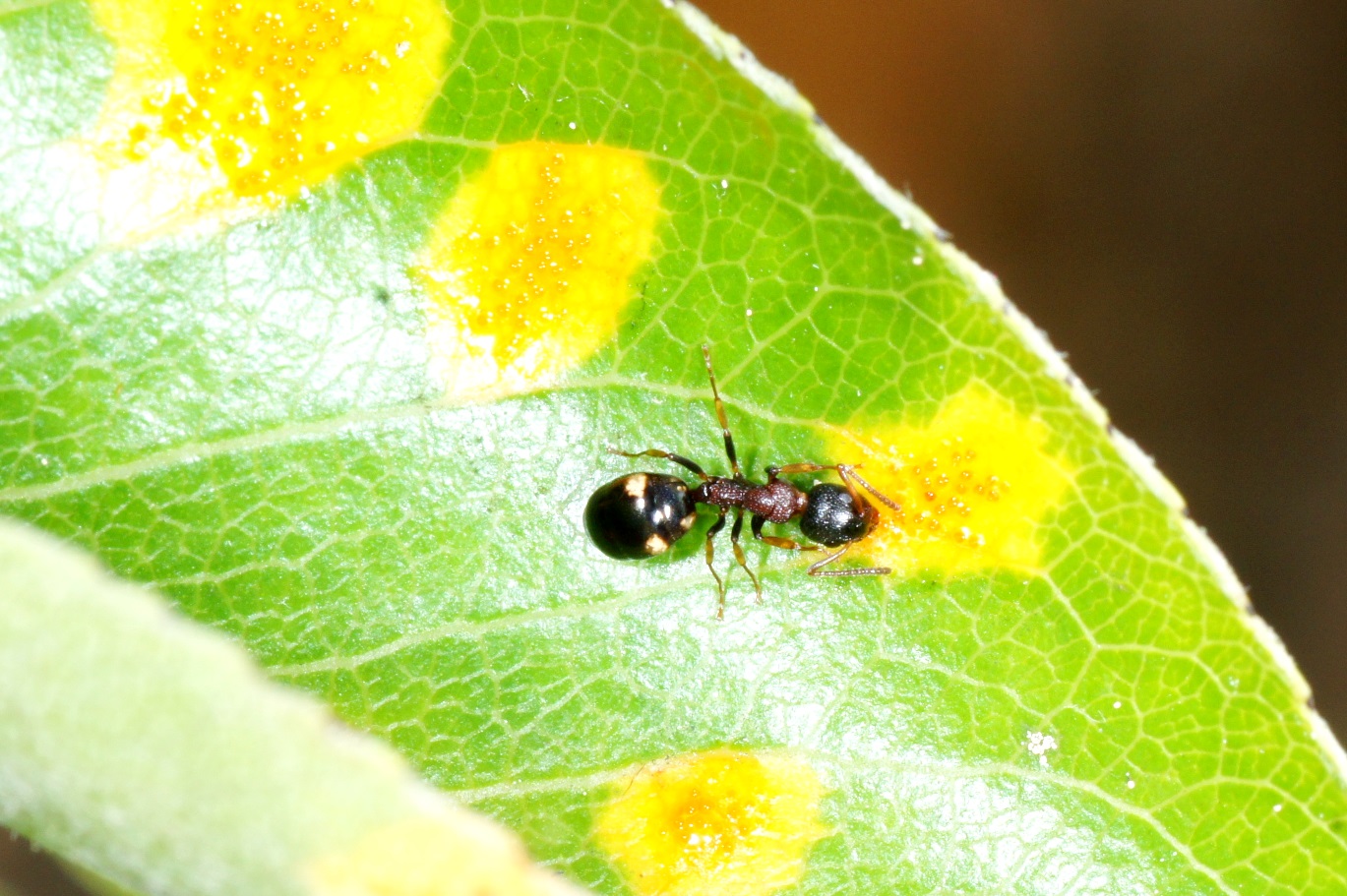 Bei der Betrachtung der Blätter meines Birnbaumes, der vom häufigen Birnengitterrost(Gymnasporangium sabinae) befallen ist, ist mir aufgefallen, dass in kurzen Abständen eine Polistes dominula, eine Fliege und dann Ameisen an dem orangen Sporenlagern geleckt haben. Da musste ich mich gleich schlau machen und ich zitiere die Eintragung im Wikipedia: Möglicherweise helfen die auffällige Farbe und ausgeschiedener "Nektar" Fliegen und Wespen anzulocken, die zur Verbreitung der Sporen beitragen. Unter dem Bino konnte ich feststellen, dass die napfartigen, rötlichen Sporenlager an der Spitze kleine Tröpfchen einer Flüssigkeit absondern.