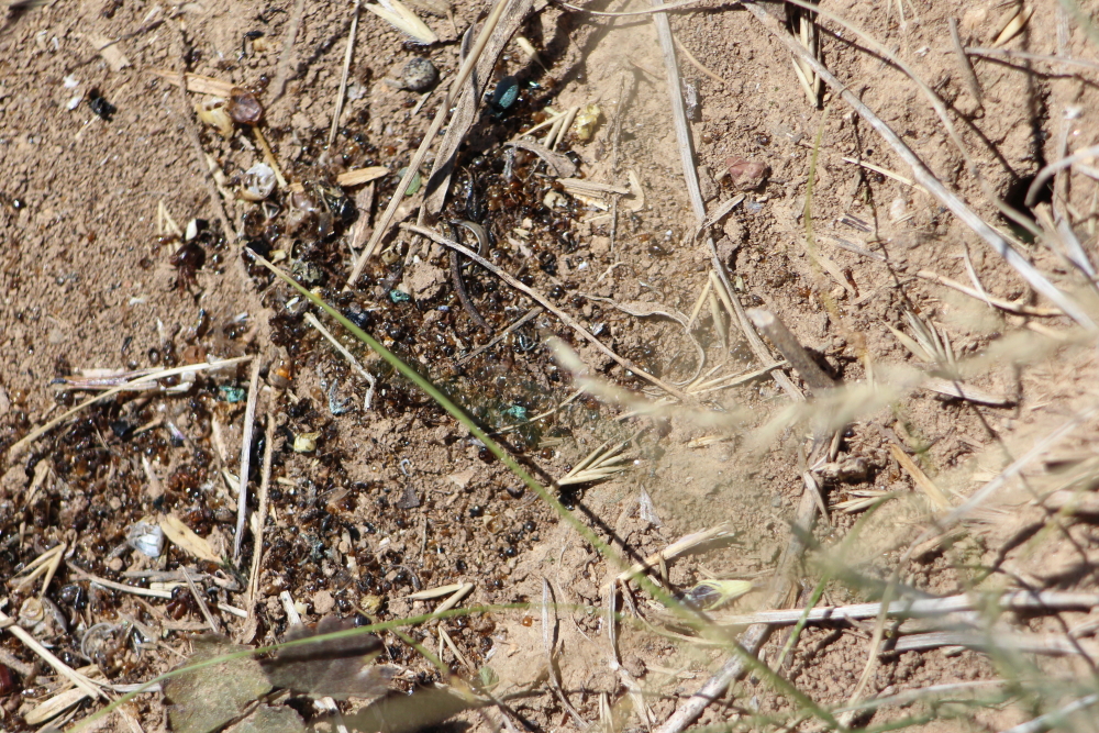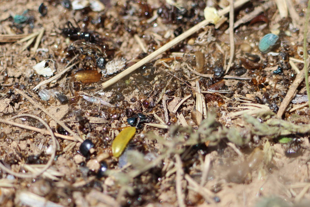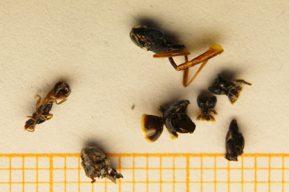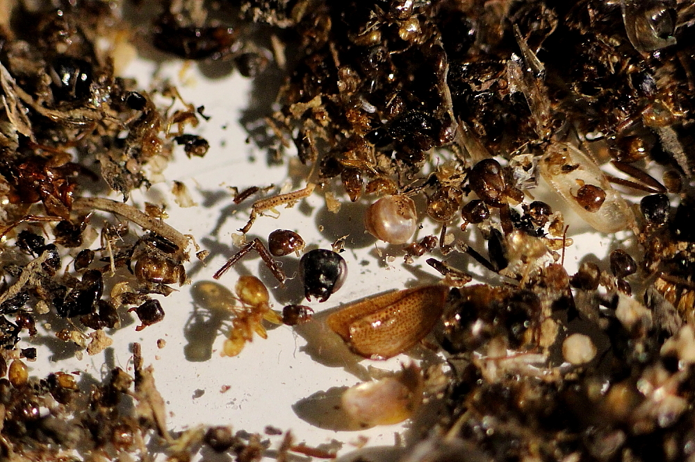 Der mit Häufigkeit auffälligste Anteil in dieser "Müllhalde" sind Gynen (und deren Einzelteile) der Diebsameise Solenopsis fugax, die Abdomen immer beschädigt und leer.