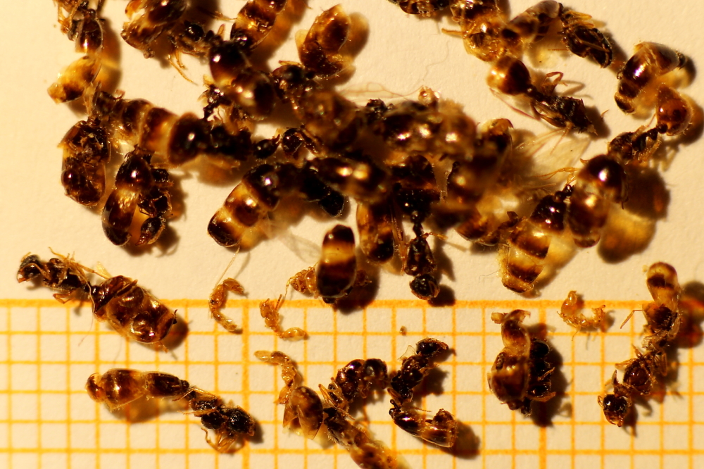 Die Vermutung, deshalb vielleicht Reste dieses Ameisen-Parasitoiden im Nestabfall finden zu können, hat sich beim Sortieren aber nicht bestätigt. Eventuell war das konkrete Volk gar nicht befallen, sondern benachbarte Nester. Oder die im Nest geschlüpften Wespen gelangen alle unbeschadet ins Freie.