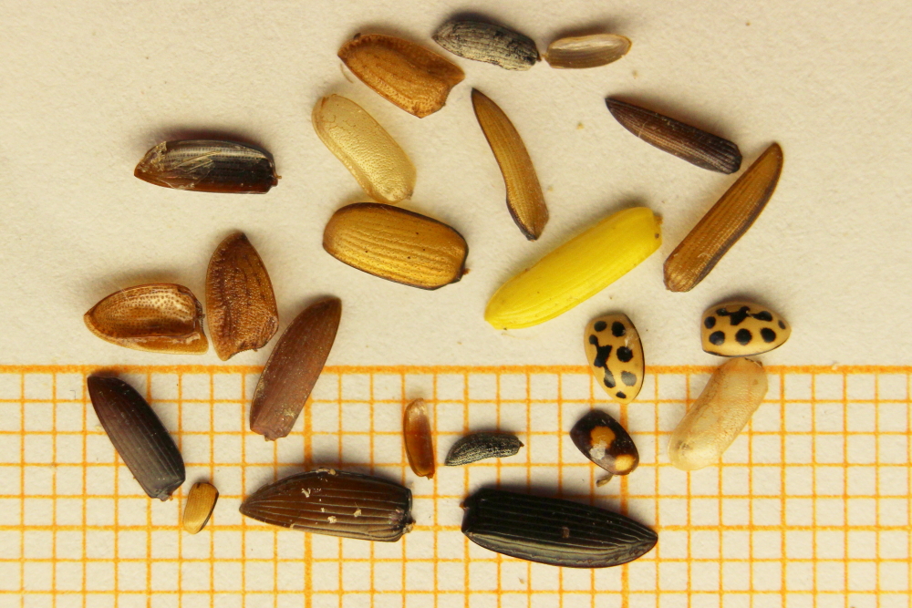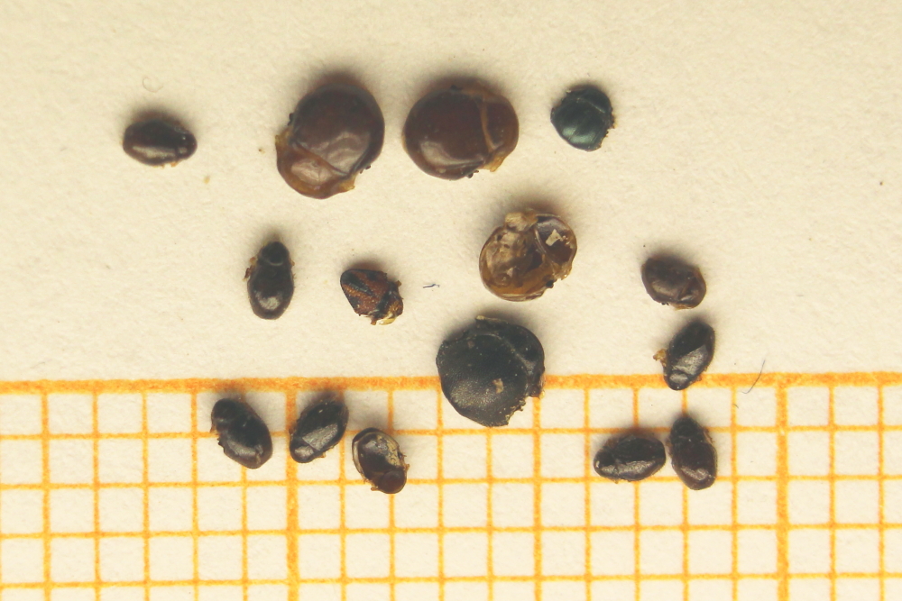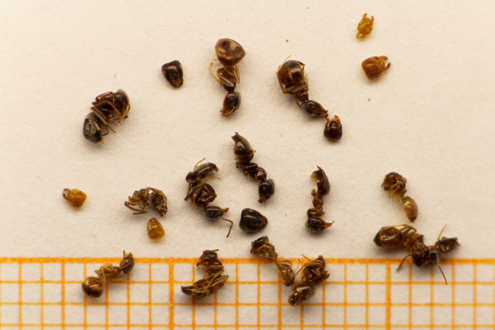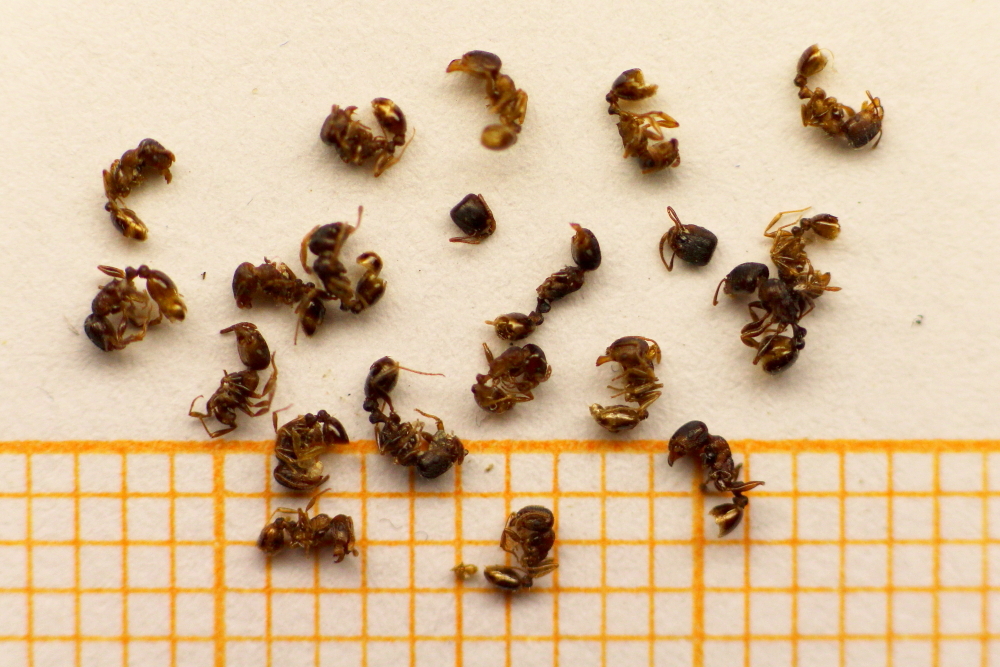 Die besterhaltenen Stücke hier auf Millimeterpapier heraussortiert. Ganz vereinzelt sind auch Arbeiterinnen von Solenopsis fugax dabei. Die könnten ja eventuell auch aus anderen Gründen aus dem Formica-Nest herausgeworfen worden sein?