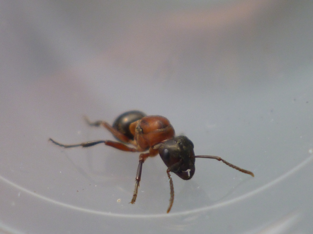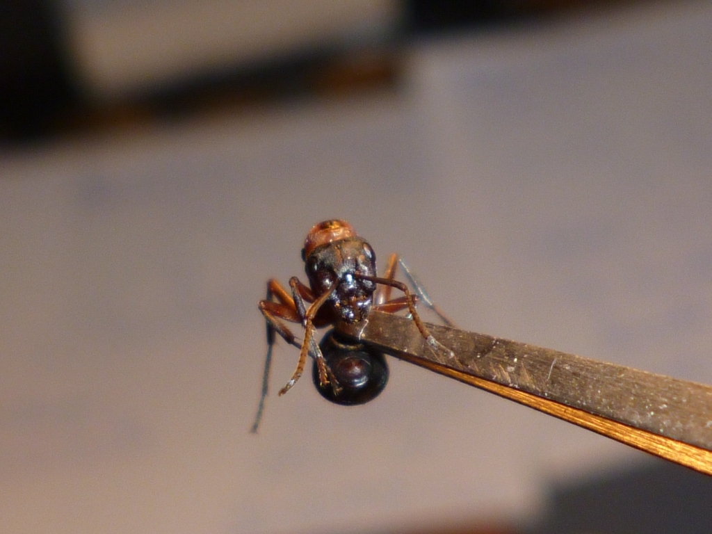 Ich habe noch ein weiteres Foto gemacht und sie dafür mit einer Federstahlpinzette vor die Kamera gehalten. Ich kann leider keine deutliche Einbuchtung erkennen und der Kopf ist sehr dunkel, so dass ich nicht mehr viel Hoffnung habe, dass es sich um Formica sanguinea handelt sondern wohl eher um Formica polyctena.