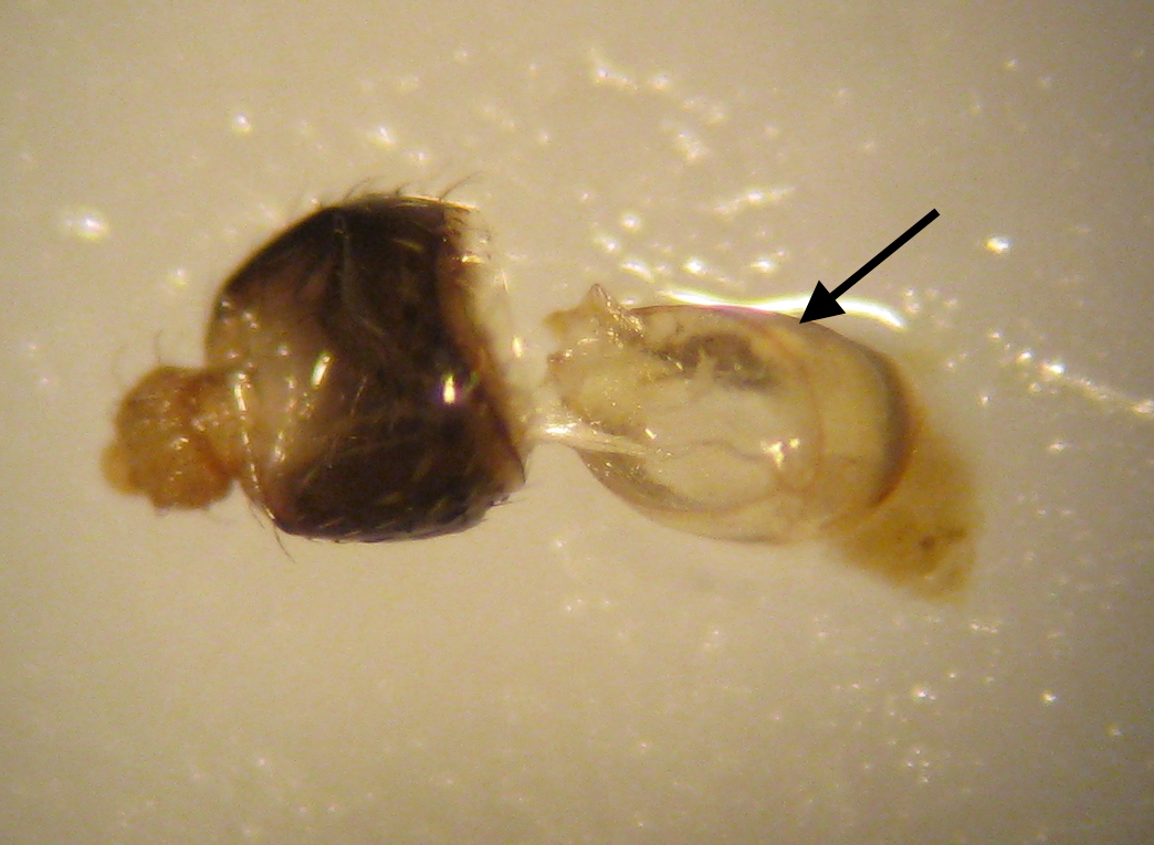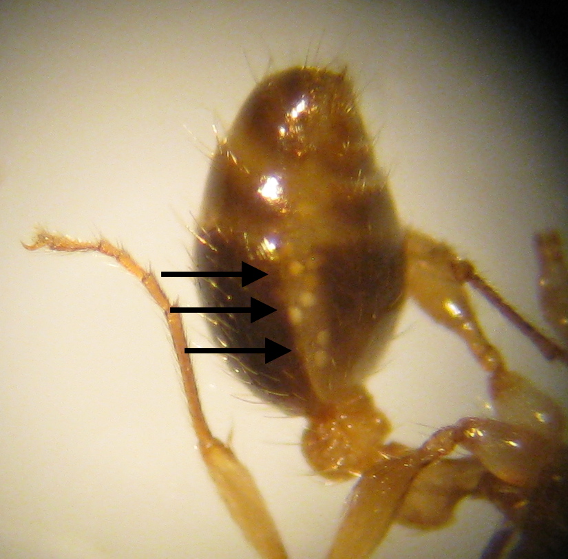 bei einer Tetramorium-Art konnte ich weiße “Punkte” bzw. Flecken in der Gaster von (hauptsächlich jungen) Arbeiterinnen und Puppen, sowie in Larven entdecken - siehe angehängte Fotos. Die Verfärbungen sind innerlich, wenn auch sehr nahe an der Oberfläche. Die Cuticula selbst ist unversehrt und an den betroffenen Stellen keinesfalls erhaben; um Ektoparasiten scheint es sich nicht zu handeln. Zu sehen sind die Flecken bei manchen, aber nicht allen, Larven, Puppen, sowie Arbeiterinnen. Innerhalb der Arbeiterinnenschaft treten sie vorrangig bei helleren, also wahrscheinlich jungen, noch nicht voll ausgefärbten Arbeiterinnen auf. Bei fouragierenden Arbeiterinnen, welche in der Regel ja älter sind, konnte ich die weißen Flecken bislang noch nicht beobachten. Bei Arbeiterinnen und Puppen sind die Flecken ausschließlich im Gaster festzustellen.