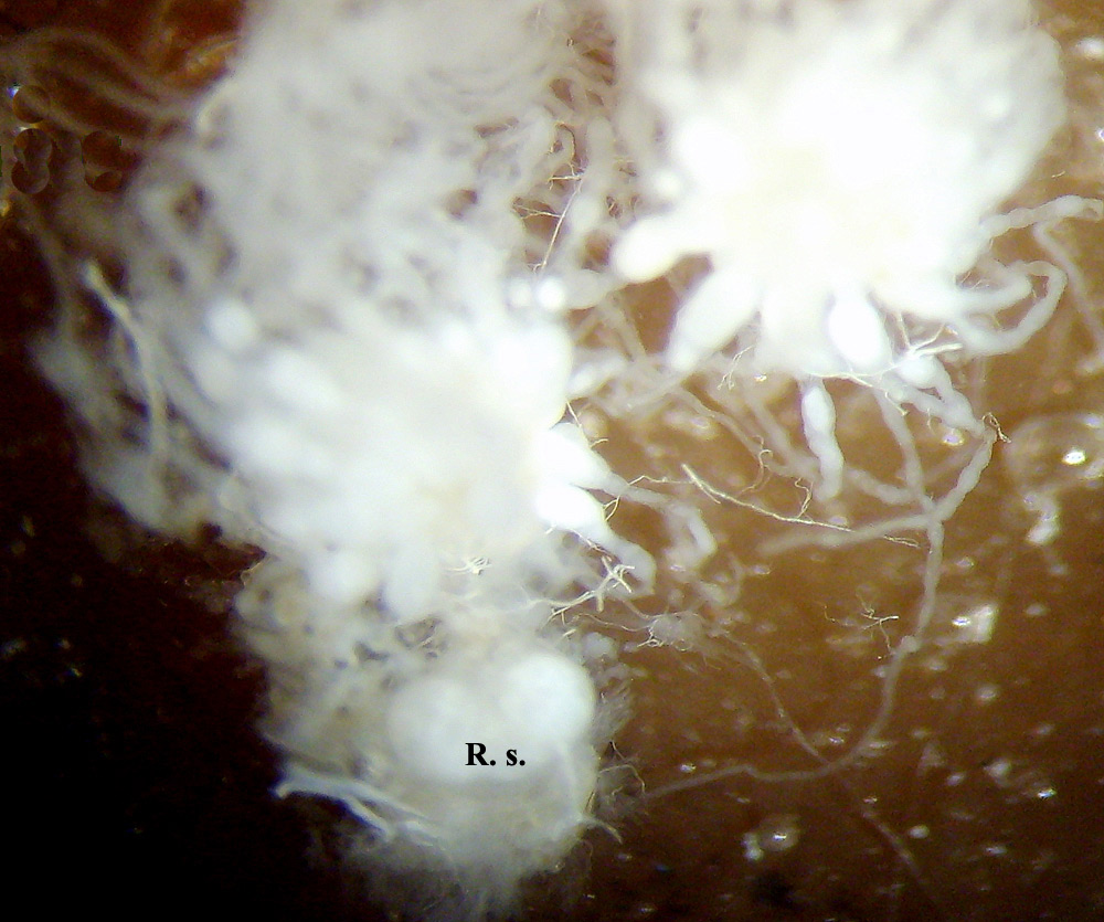 Gyne 2. Die beiden Ovarien mit zusammen ca. 70 Ovariolen. R. s.: Das etwa hantelförmige Receptaculum.
