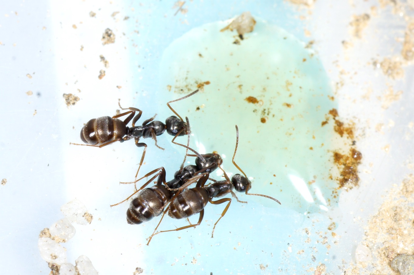 Meine Terrarien und Boxen wurden in das Glashaus verlagert, da gibt es deutliche Tagesschwankungen von wenigen Graden über Null bis zu 15 oder 20°C. Diese Maßnahme dient der Vorbereitung auf die eigentliche Winterruhe: Camponotus aethiops, Messor structor, Camponotus lateralis, Plagiolepis pygmaea, Liometopum microcephalum und Formica lemani. Die letzten 3 genannten Arten nehmen noch Kohlehydrate an, hier z. B. F. lemani: