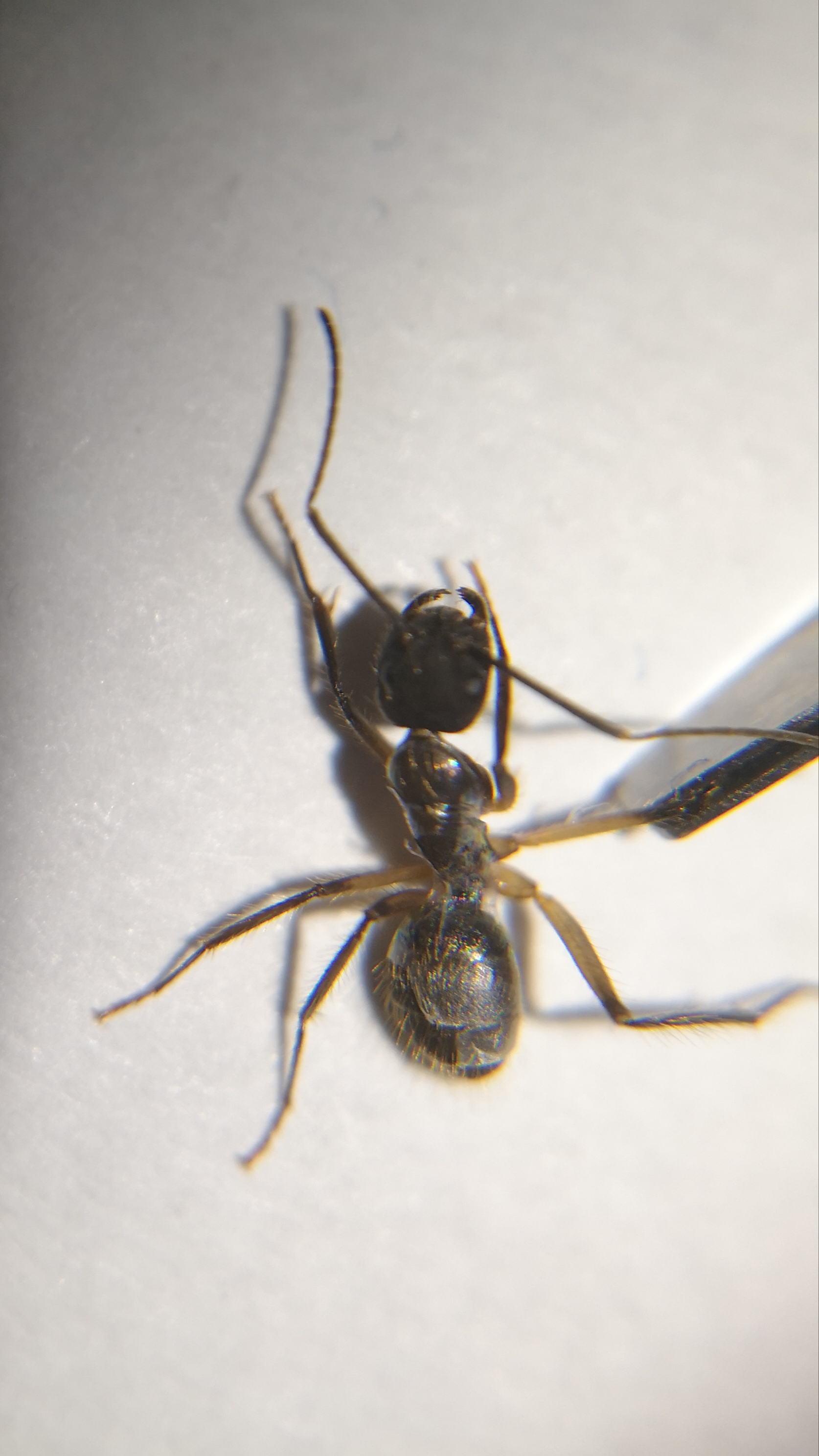 Vor kurzem habe ich in das Formikarium meiner Camponotus brasiliensis geschaut und eine silbern schimmernde Arbeiterin entdeckt. Unter dem Mikroskop betrachtet dachte ich, dass Tier hätte mit der Cuticula verklebte Flügel. Dazu kam, dass die Arbeiterin äußerst verlangsamt, der Kopf leicht deformiert und die Schuppe nicht zu finden war.