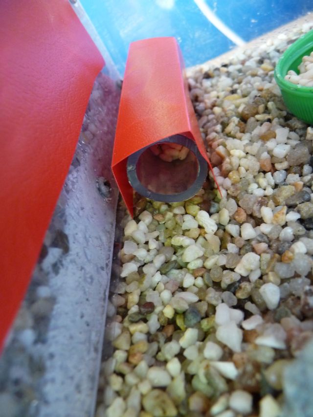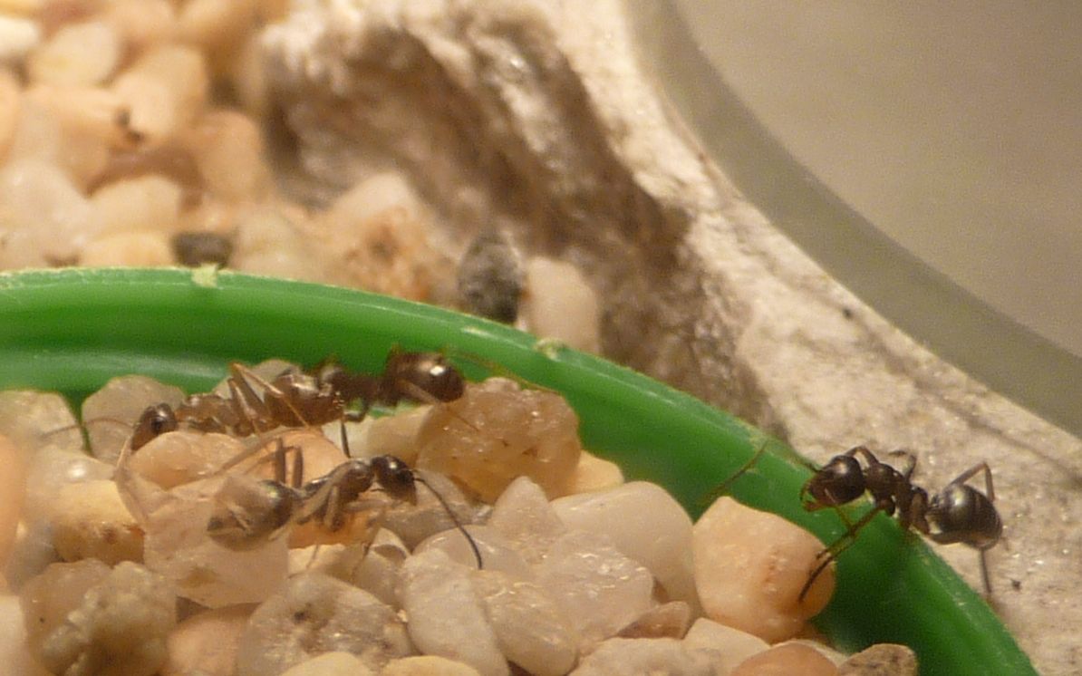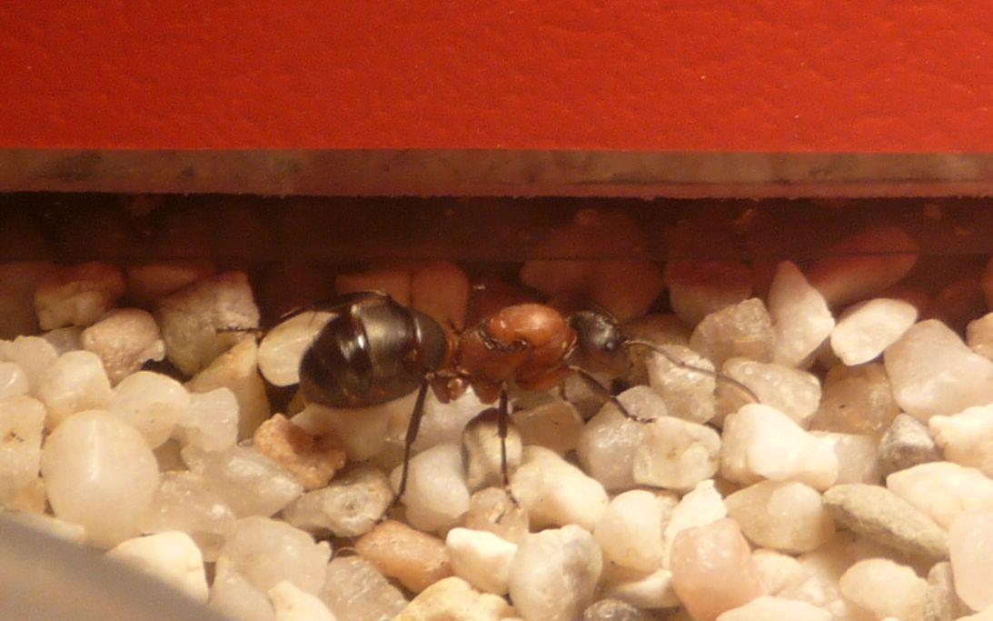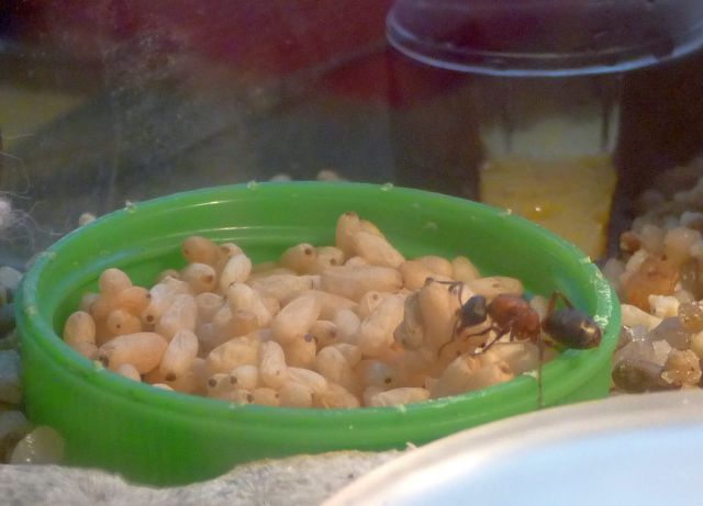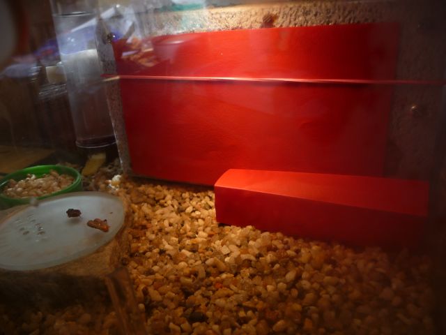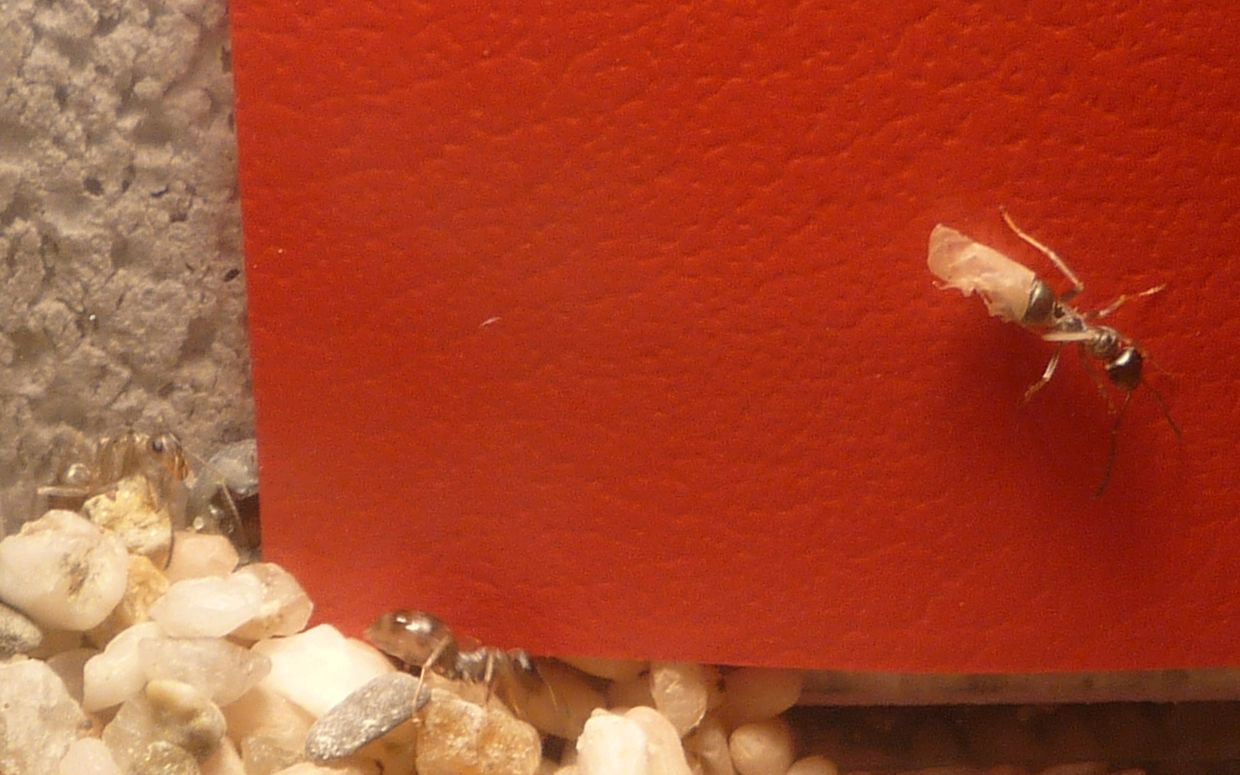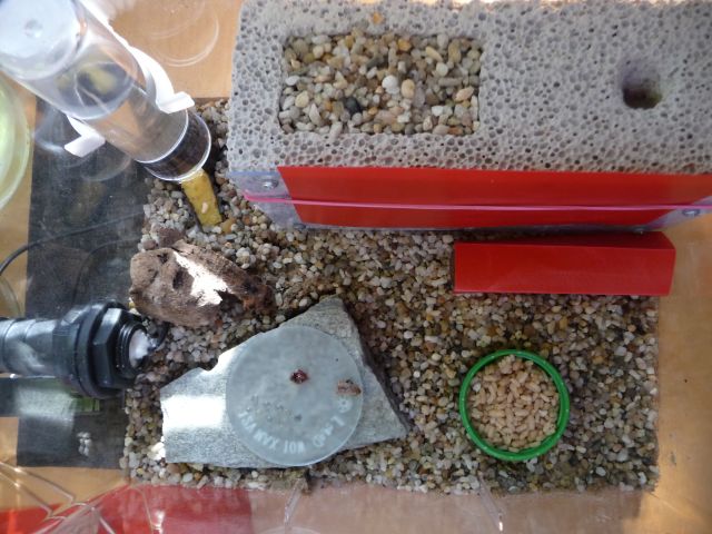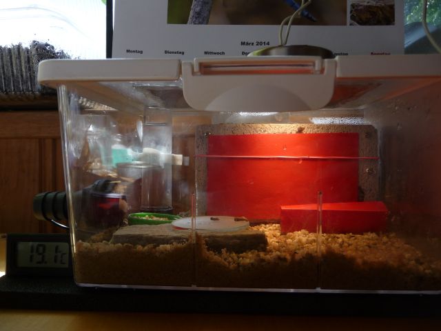 Die Puppen wurden (nach Art getrennt) in das Formicarium gegeben. Ich begann, tagsüber das Porenbeton-Nest durch einen von außen auf die Rückwand gerichteten Halogenspot zu erwärmen und bot sicherheitshalber noch ein zusätzliches in Form eines Aquarienschlauchs an, der mit roter Folie verdunkelt wurde, da die Königin bislang das Porenbetonnest nicht angenommen hatte. Eventuell war es zu feucht, da sich nach Erwärmung viel Kondenswasser sammelt. Ich schätze, ich habe den Bogen noch nicht ganz raus...