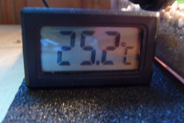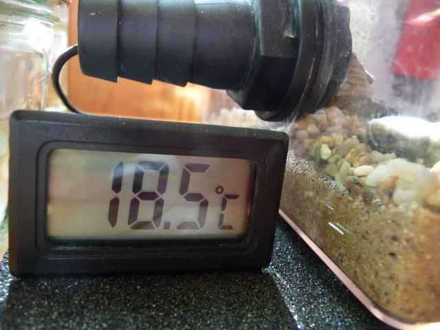 ...und hat sich bis jetzt auf 19,8°C erhöht. Ohne Spot lag die Temperatur in den letzten Tagen um etwa 20,5°C. heute habe ich den Spot auf die Belüftungsfläche gelegt, um die Temperatur zusätzlich zu steigern und so die Entwicklung der Puppen zu fördern.
