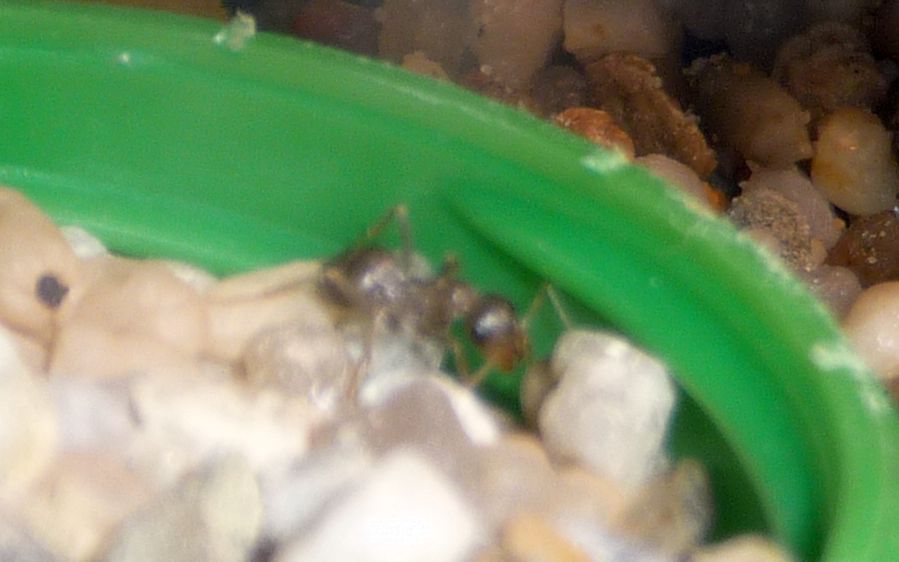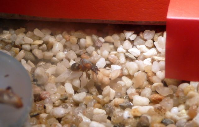 Das Formicarium hat sich mittlerweile auf knapp 24,5°C erwärmt und die Königin ist fleißig dabei, weitere F. fusca Puppen einzutragen.