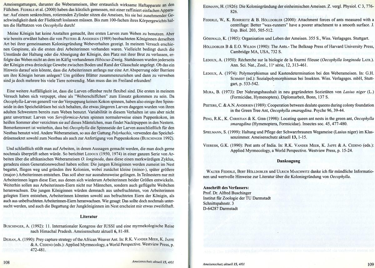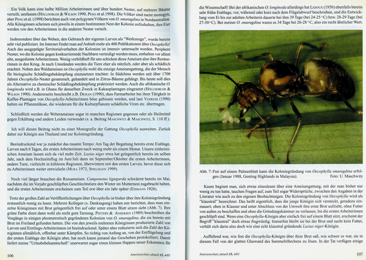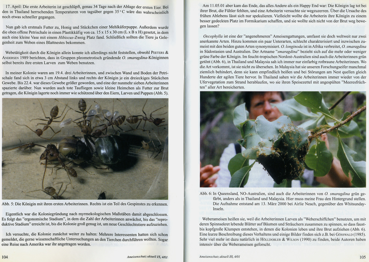 Hier kopiere ich mal einen „Haltungsbericht“ zur Koloniegründung einer Königin von Oecophylla smaragdina aus Thailand ein. Der Artikel erschien 2001 in der Zeitschrift der Deutschen Ameisenschutzwarte, in der ich immer wieder etwas schreibe, und in der man nicht nur über Waldameisen Neues und Interessantes erfahren kann. Ein Inhaltsverzeichnis der Zeitschrift ist hier zu finden.