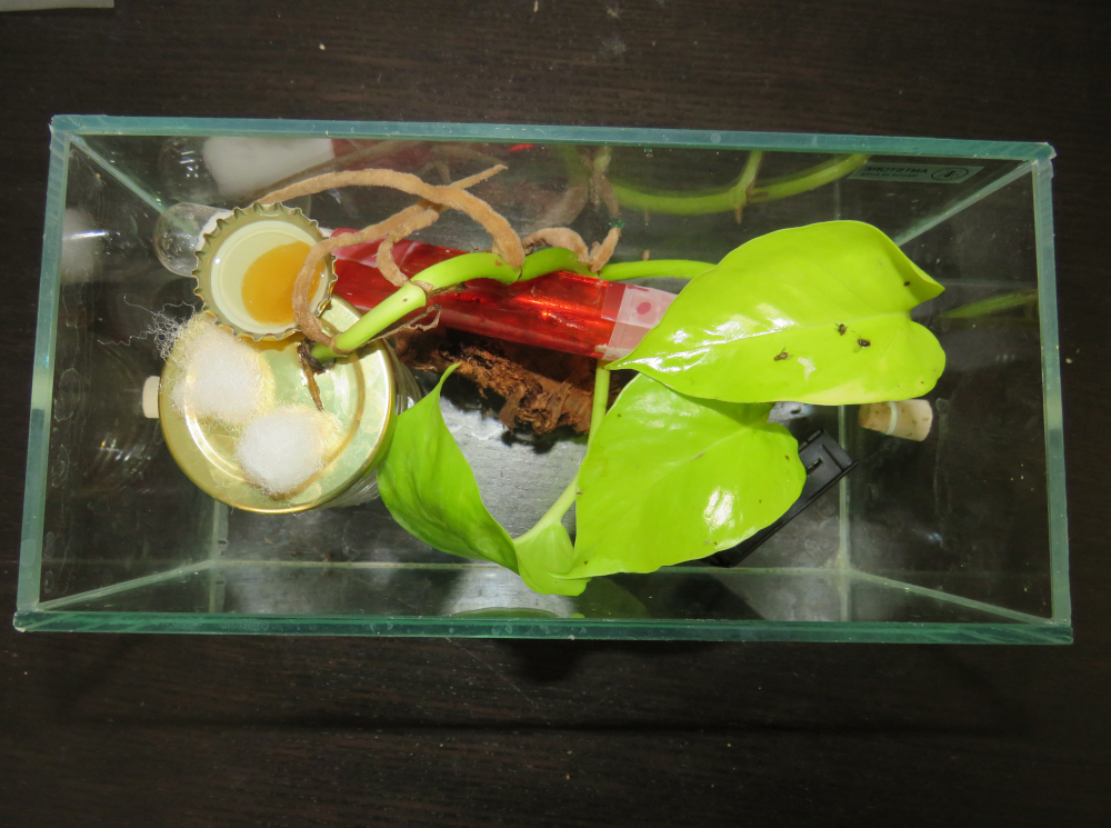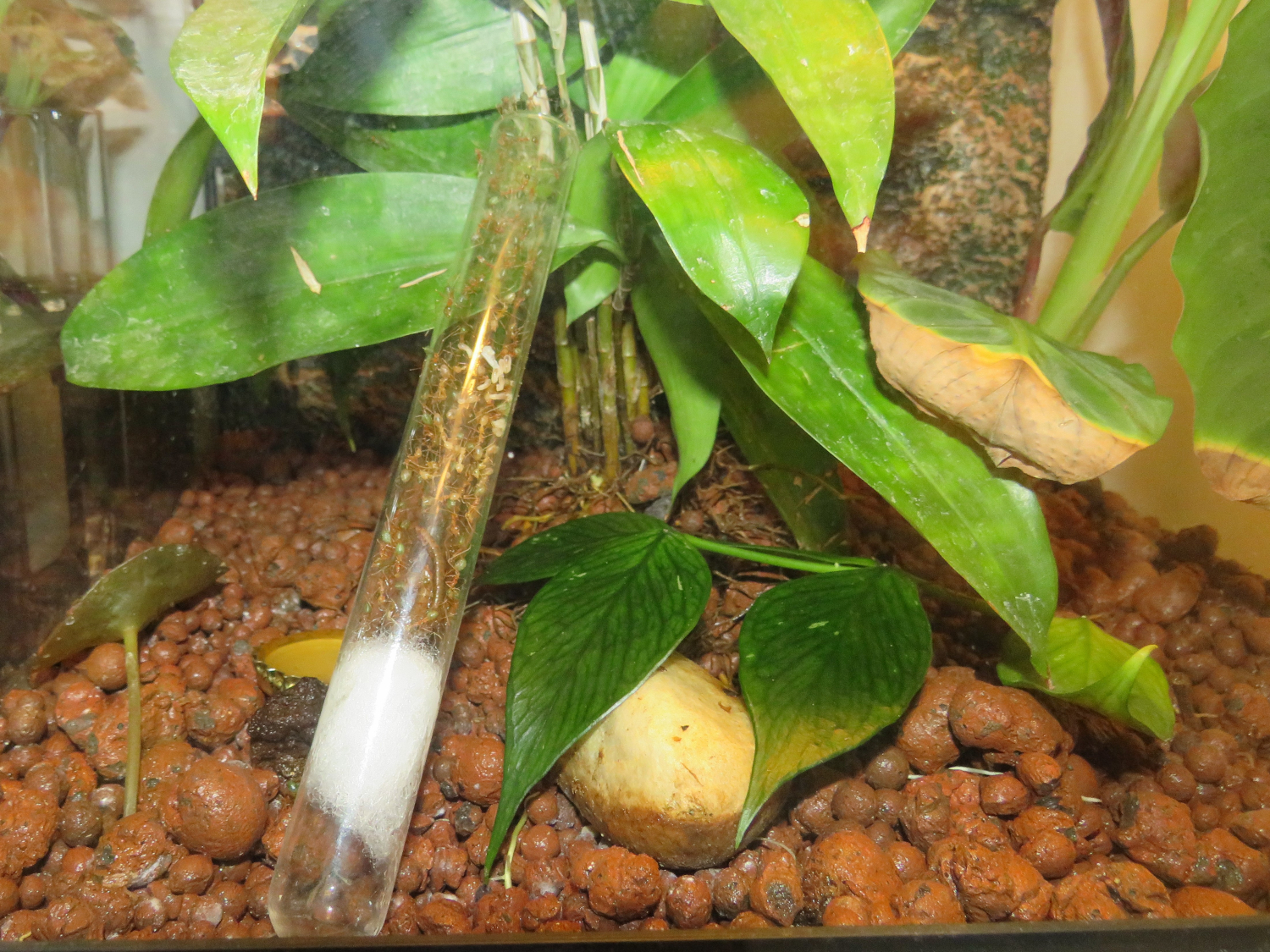 Aus diesem Grund habe ich mir auch überlegt, ob ich die Tiere gleich ins vorgesehen Terrarium verbringen soll. Eigentlich wollte ich 6 Monate warten, bis ich die Asiatische Weberameisen umsetzen, da ich allfälligen Vergiftung durch Pflanzenschutzmittel vorbeugen wollte. Der Bambus-Drachenbaum (Dracaena surculosa) stammt nämlich aus einem Baumarkt und es wäre unschön, wenn allfällige Pestizidrückstände das Ende der Kolonie herbeiführten. Zur Sicherheit habe ich nun vor wenigen Tagen einige „Versuchstiere“ in einem Reagenzglas ins Terrarium gesetzt. Auch um herauszufinden, ob ich den Kasten wirklich "ameisendicht" hinbekommen habe.