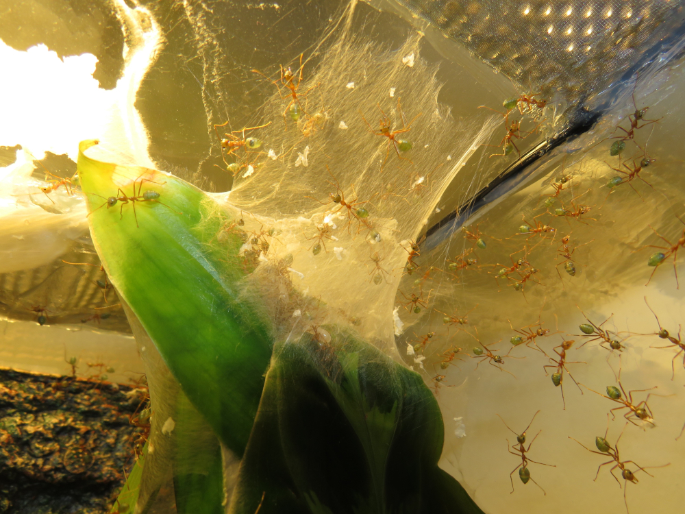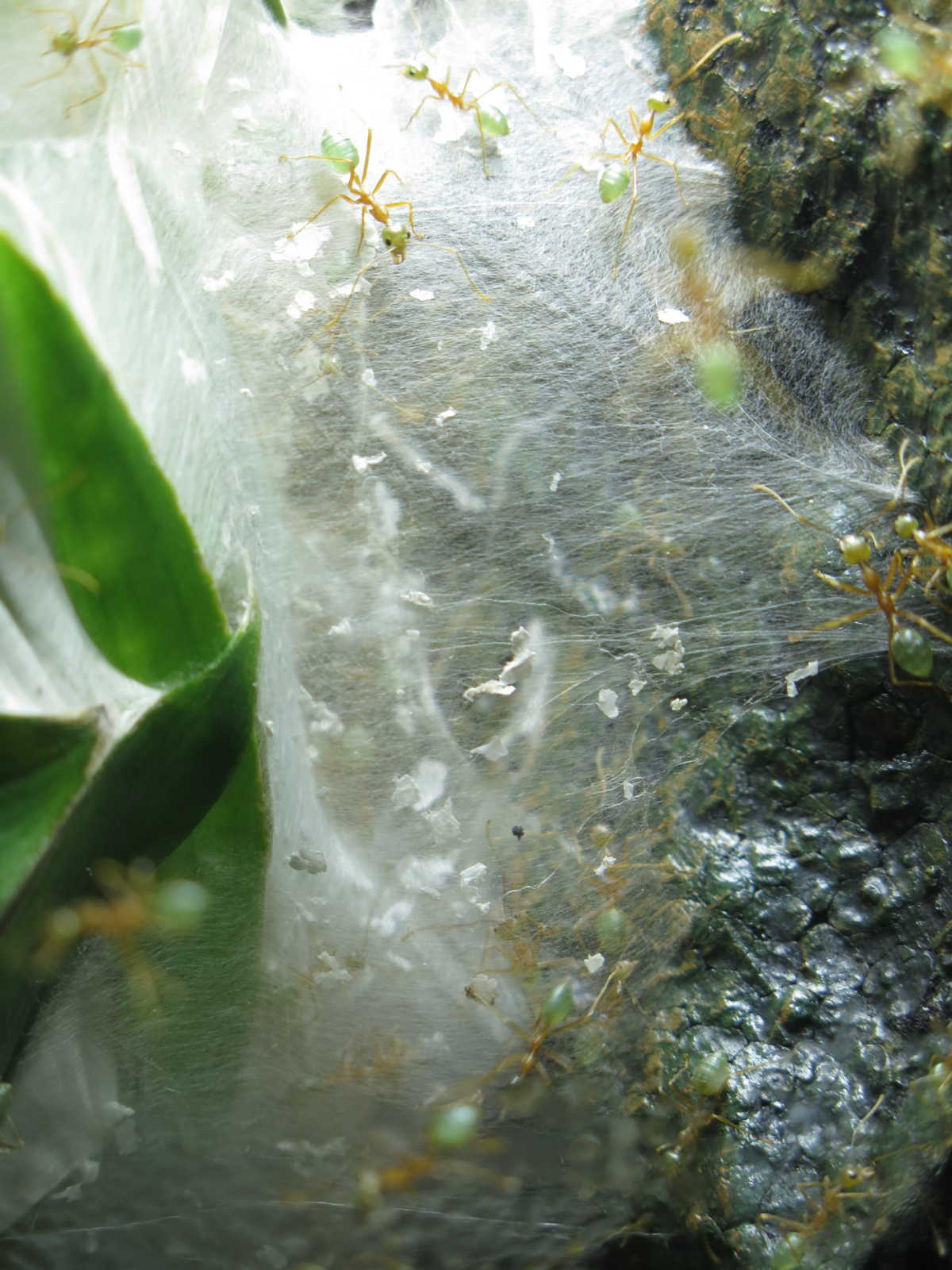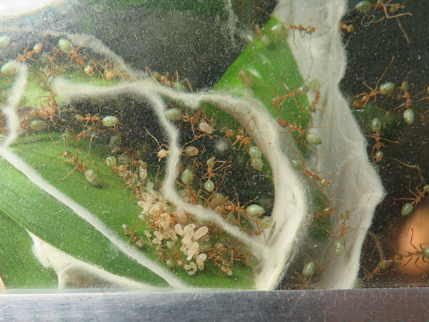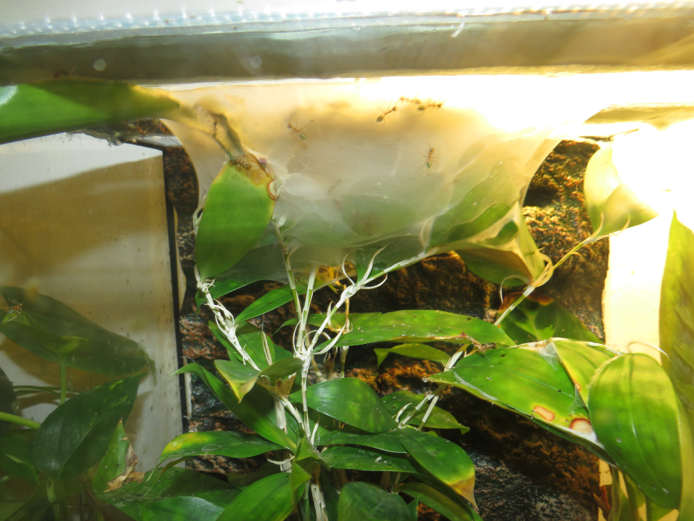 Die Entwicklung bei Oecophylla smaragdina geht bei rund 29 °C und einer Luftfeuchtigkeit von 60% - 80% rasch voran. Die Ameisen sind alles andere als lichtempfindlich und zum Bau ihres Nestes nur teilweise auf Blätter angewiesen. Sie haben ihr Seidennest nun an der Frontseite des Terrariums so erweitert, dass ich über optimalen Einblicke verfüge: