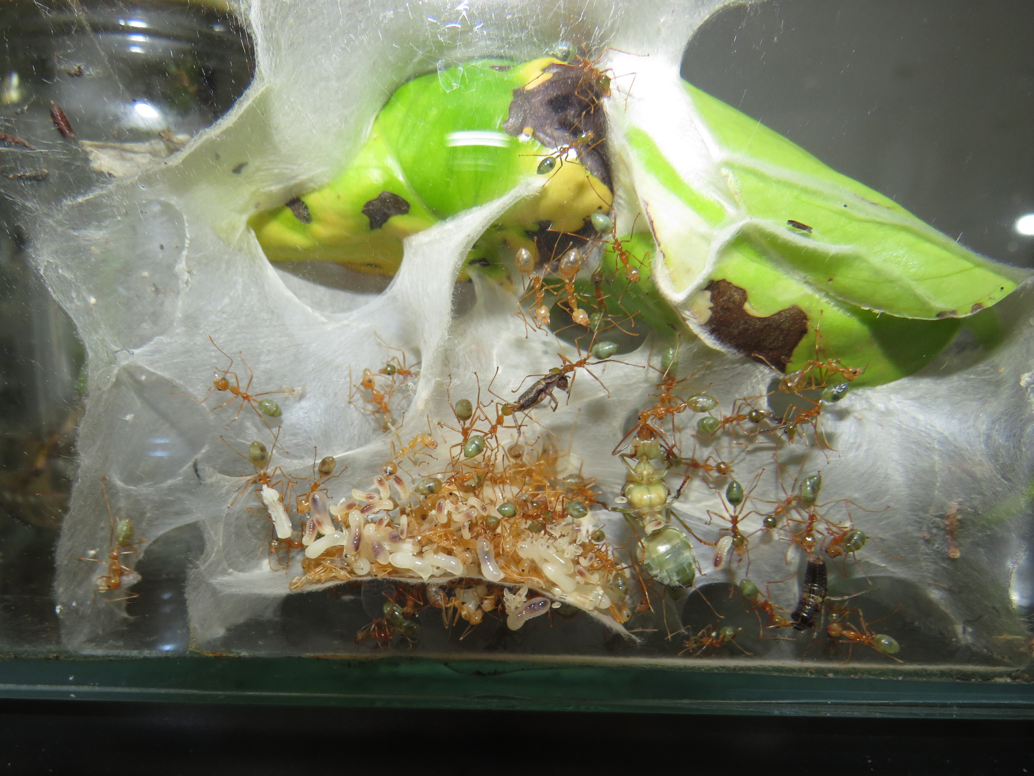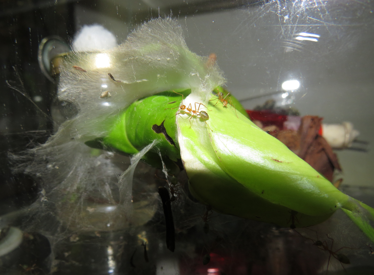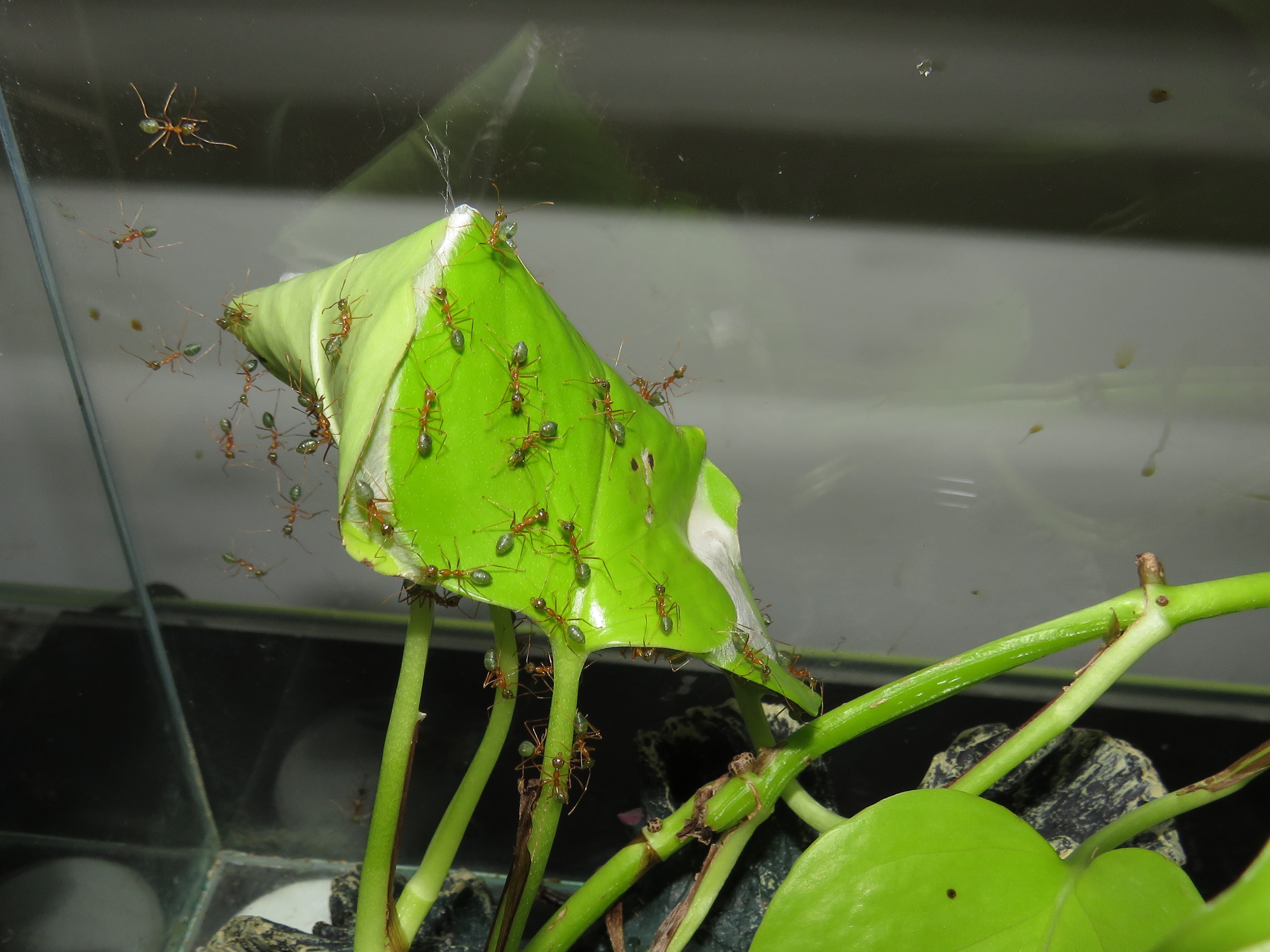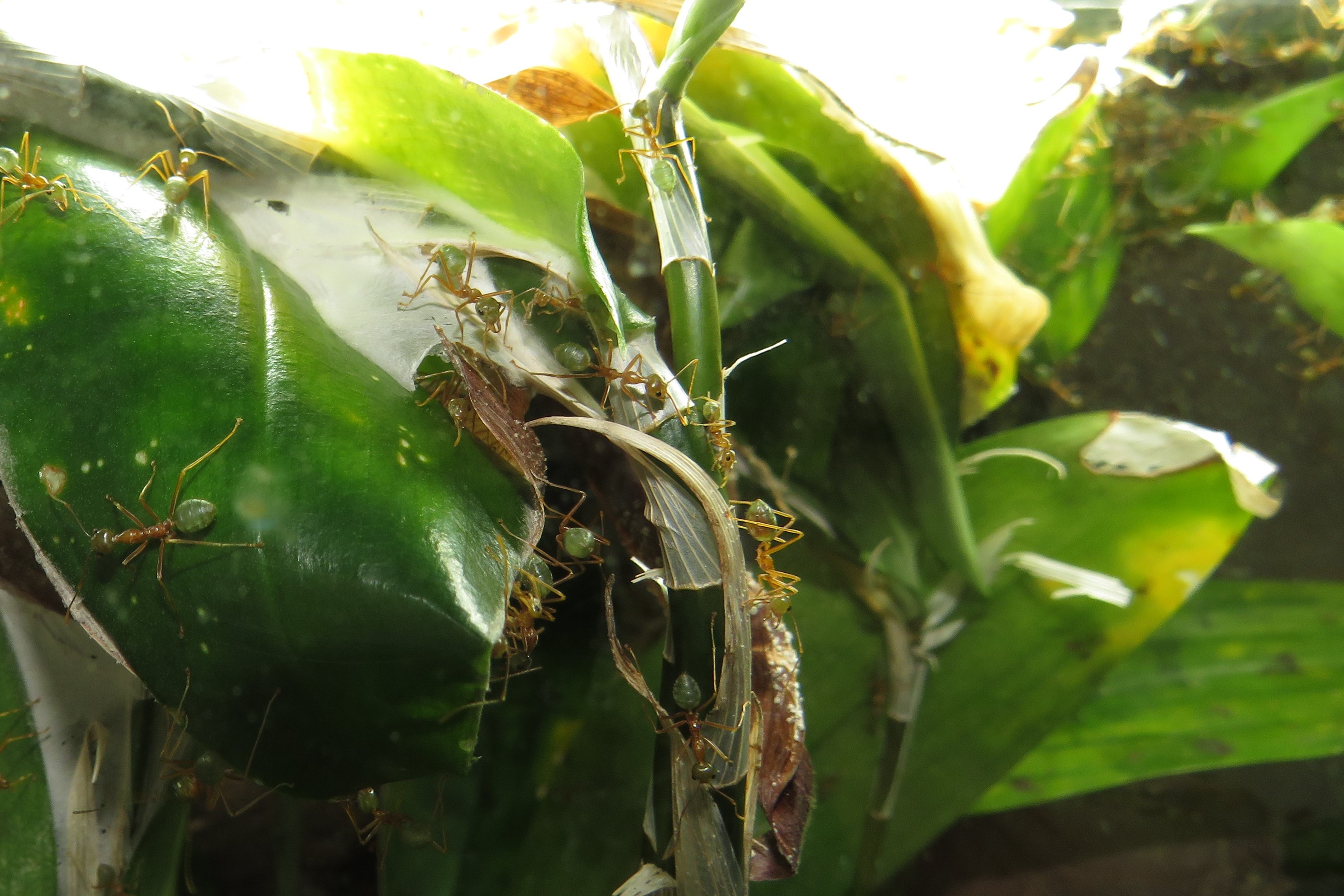 Die Entwicklung bei Oecophylla smaragdina geht bei rund 29 °C und einer Luftfeuchtigkeit von 60% - 80% rasch voran. Die Ameisen sind alles andere als lichtempfindlich und zum Bau ihres Nestes nur teilweise auf Blätter angewiesen. Sie haben ihr Seidennest nun an der Frontseite des Terrariums so erweitert, dass ich über optimalen Einblicke verfüge: