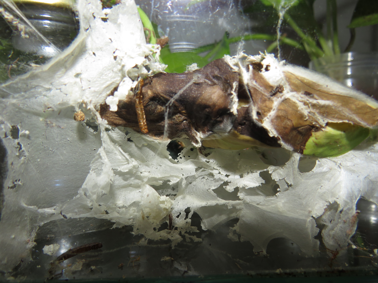 Die Tierchen haben bei mir ihr erstes Seidennest aus Efeutute-Blättern gewoben:
