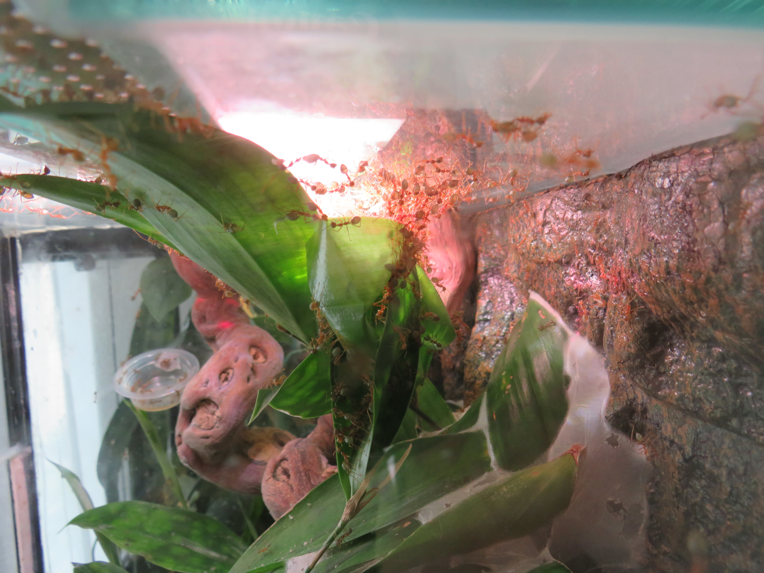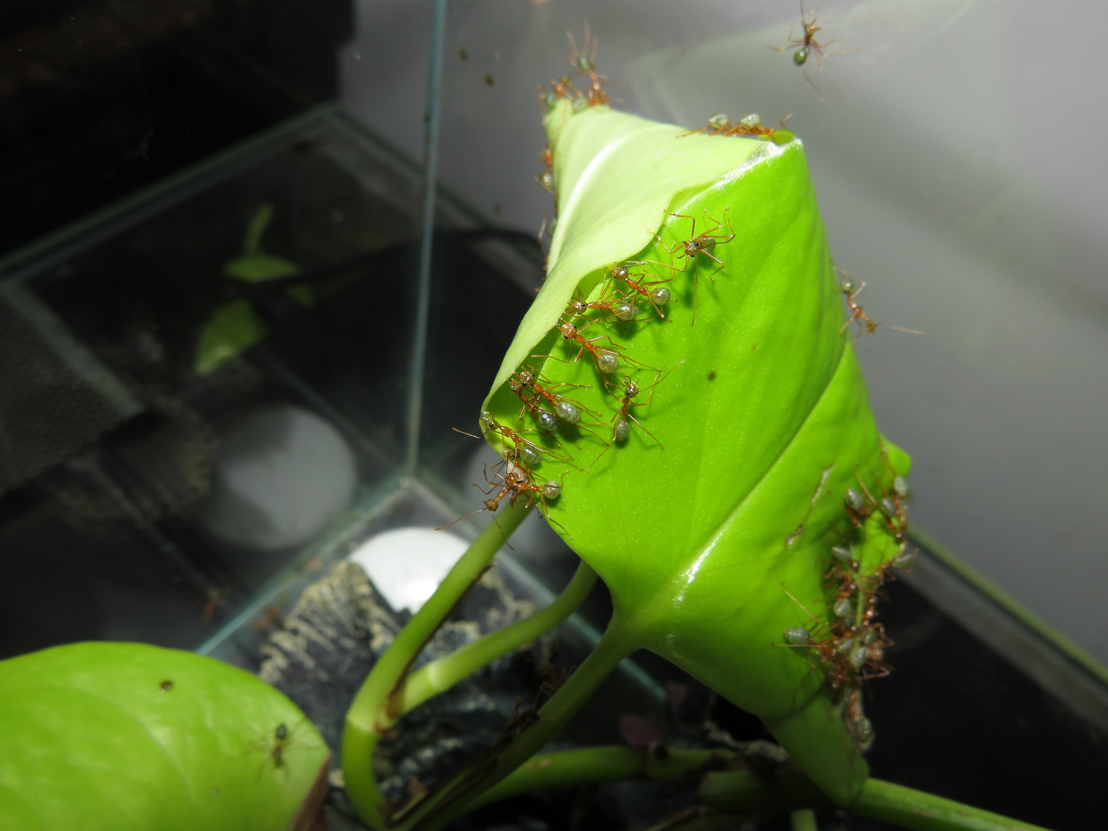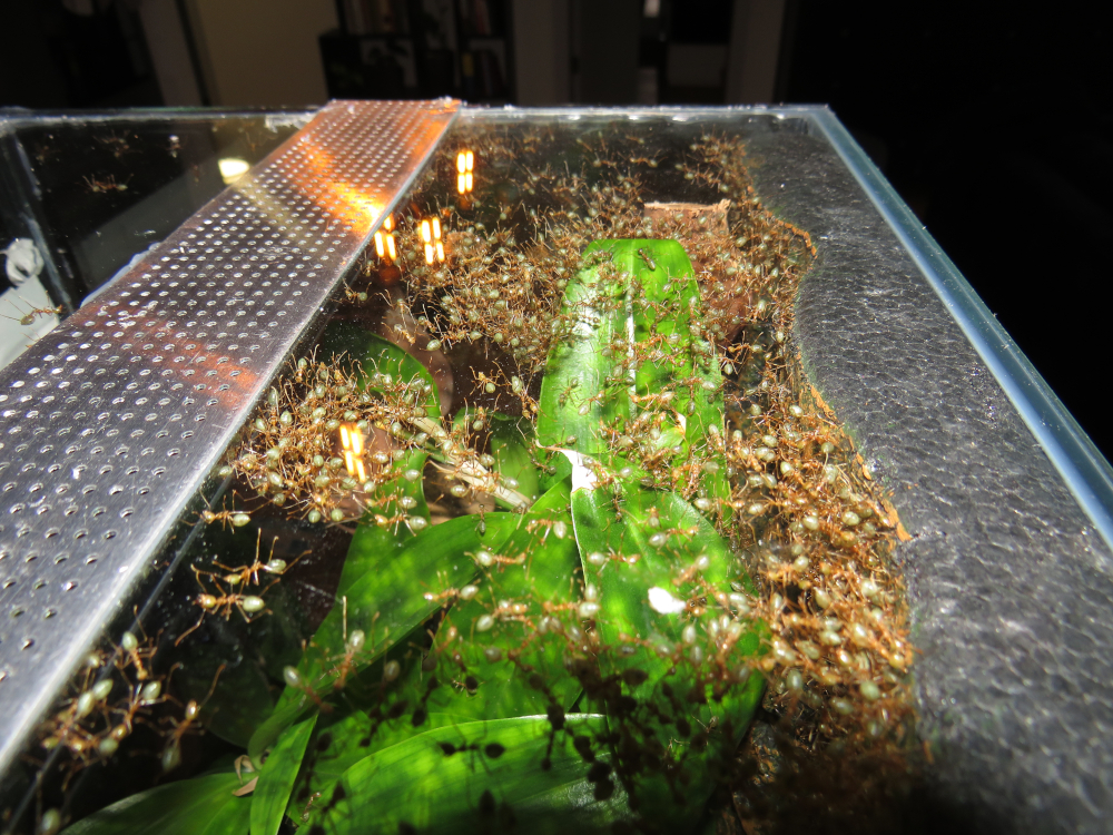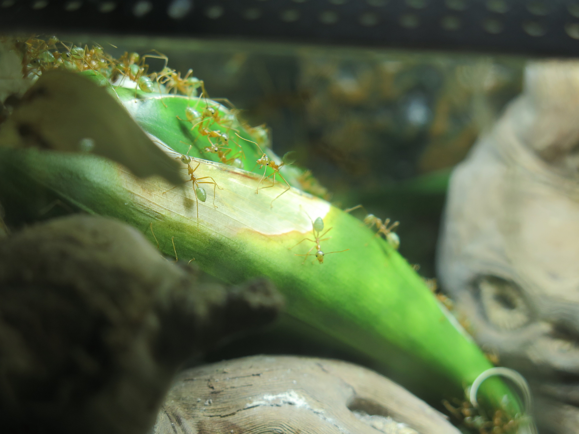 Meinen Oecophylla smaragdina ist es in ihrem alten 30 x 30 x 40 cm Becken etwas zu eng geworden. Beziehungsweise leiden vor allem die Pflanzen und die Sauberkeit in der Anlage unter den vielen Ameisen. Die Tiere reagieren nämlich inzwischen recht ungehalten, wenn ich die Anlage zum Füttern öffne. Deshalb bekommen sie aktuell ein grösseres Terrarium (30 x 30 x 60 cm) mit kleinerer Wartungsöffnung. Hier geht es zum Baubericht.
