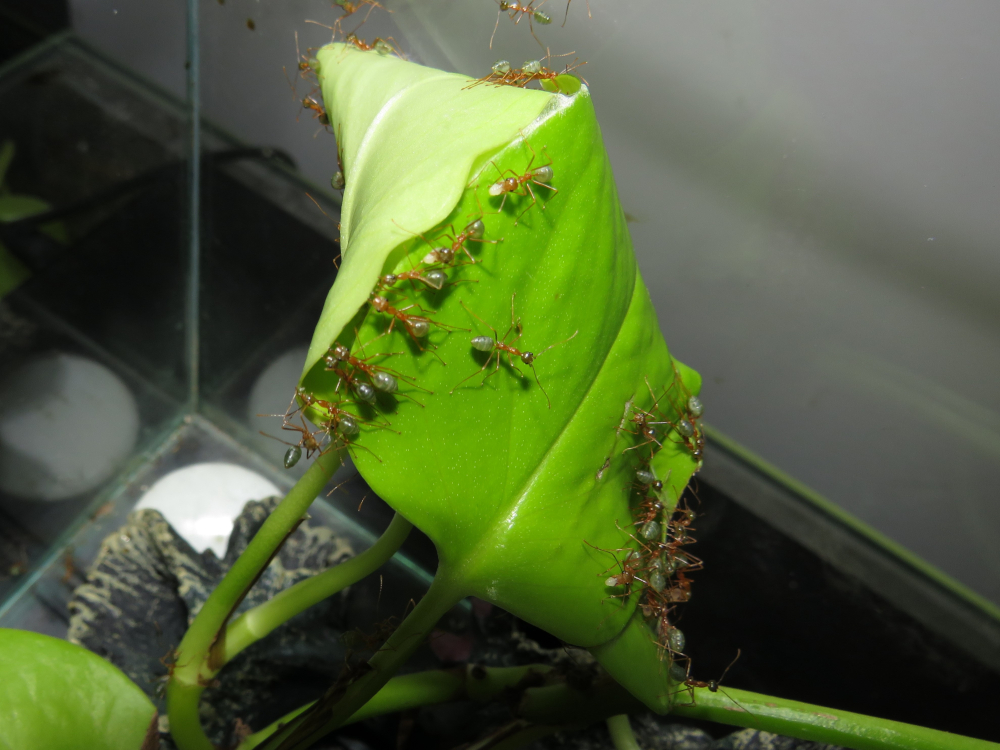 Ich finde es immer wieder faszinierend zu beobachten, wie die Ameisen grösstenteils in ihrem Revier bleiben. Sie verlassen das offene Terrarium nur vereinzelt, halten sich aber in grosser Zahl auf den Blättern auf -mit hochgestreckter Gaster, vor allem auf dem aktuellen Nest. Solange ich mit der Aquarienschere arbeite, bleiben die Tiere meist vergleichsweise ruhig. Strecke ich jedoch die Hand ins Terrarium, greifen sie mich sofort an, teilweise indem sie sich von oben auf meine Hand fallen lassen!