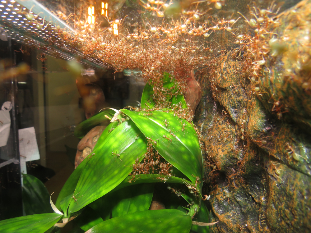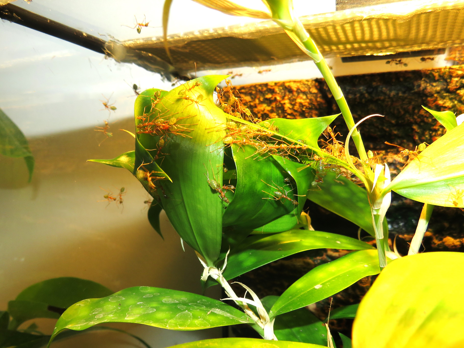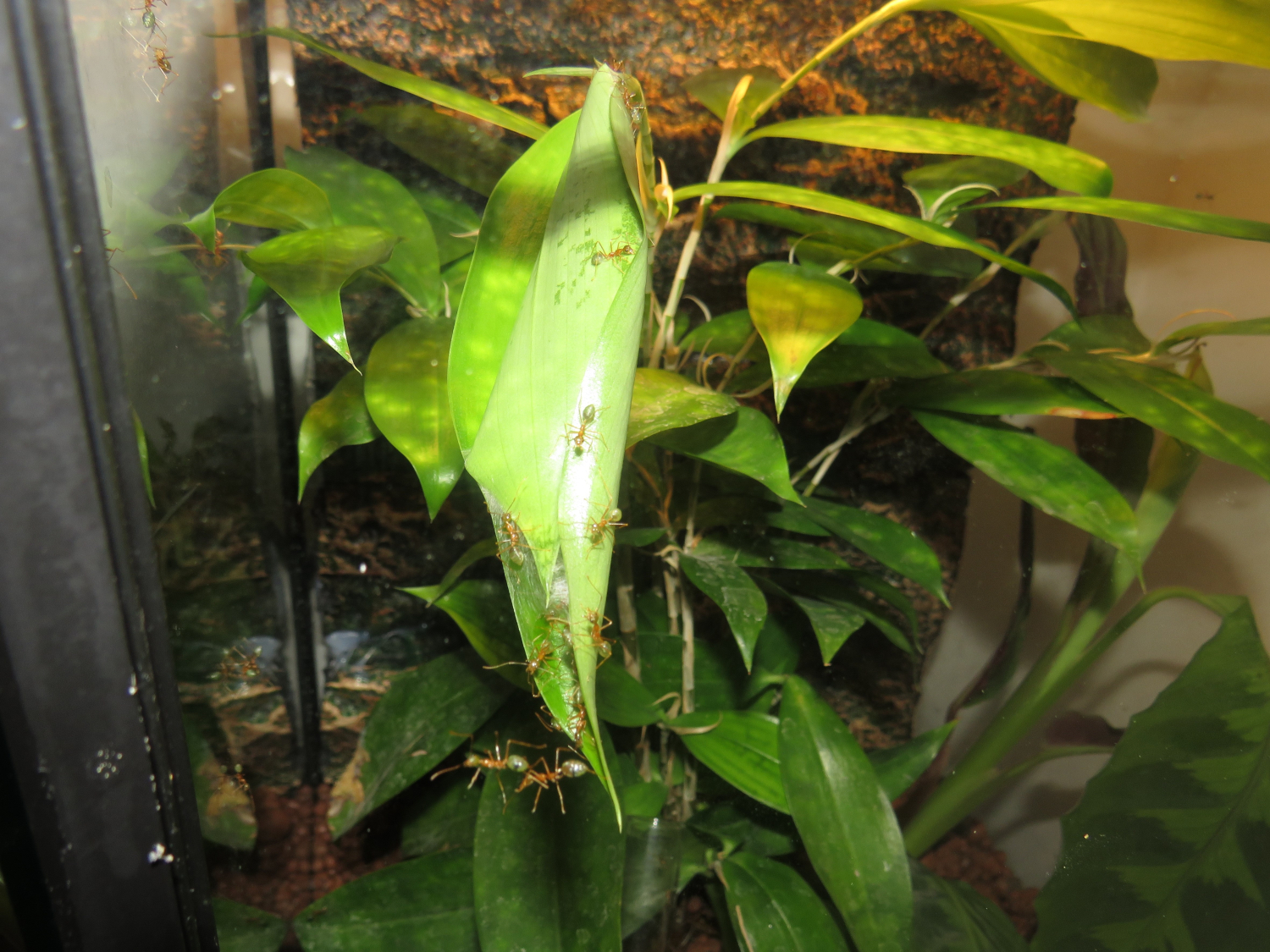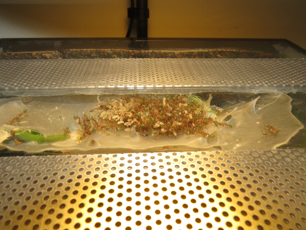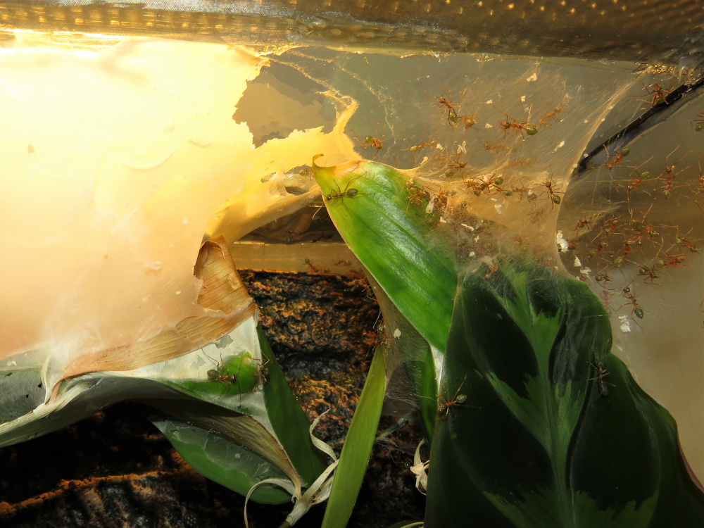Das Terrarium scheint den Tieren zu gefallen. Bereits nach drei Stunden bauen sie sich im neuen Terrarium ein Nest. Natürlich habe ich mit Beleuchtung und Wärme etwas nachgeholfen, aber Oecophylla smaragdina gehören definitiv nicht zu den "umzugsfauen" Arten.