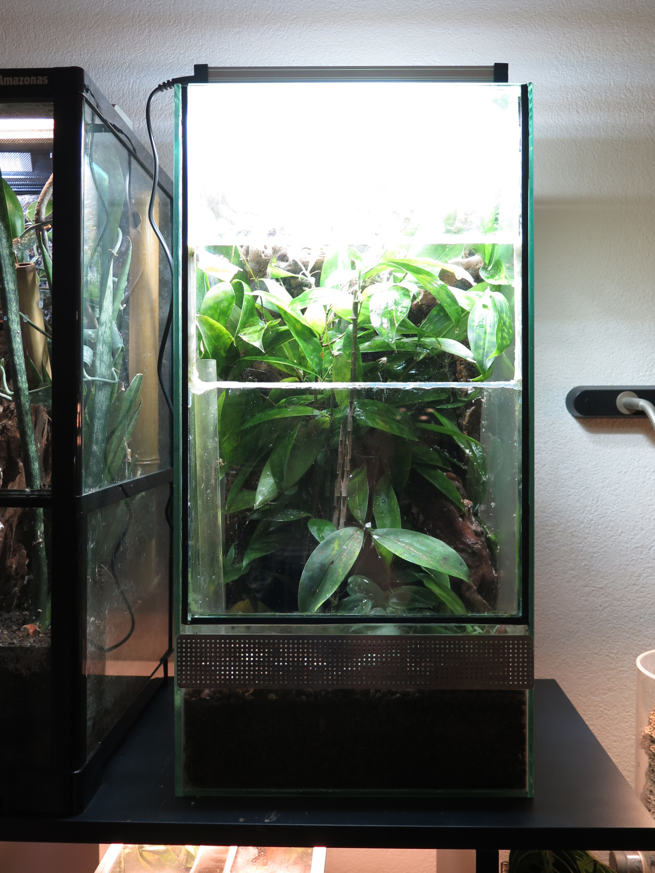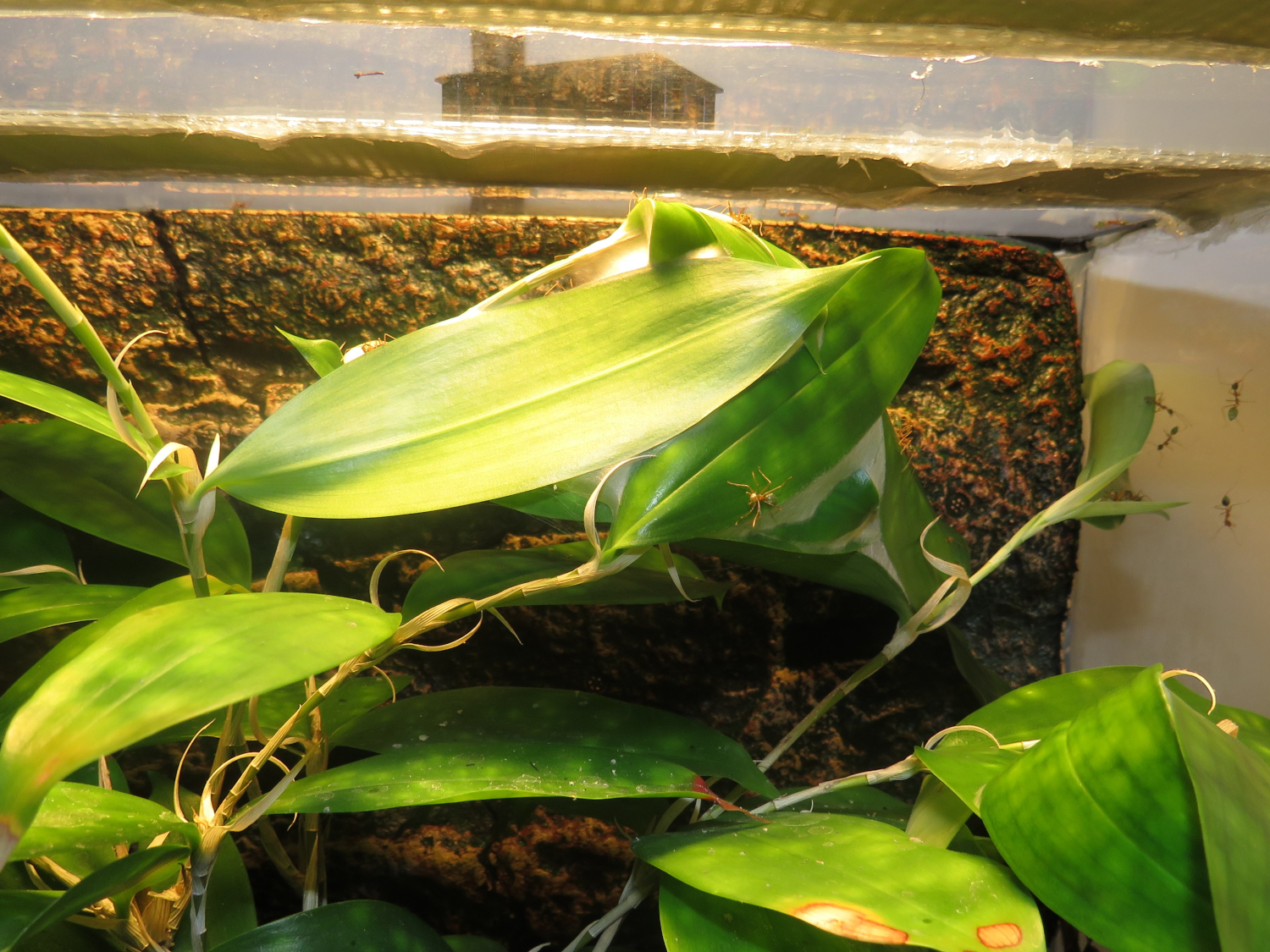 Für die Tiere steht übrigens seit rund 4 Monaten ein Terrarium mit einer Korbmarante (Calathea cf. warscewiczii) und einem Bambus-Drachenbaum (Dracaena surculosa). Da die robusten Pflanzen aus einem Baumarkt stammen, warte ich noch zwei Monate, bis ich die Ameisen umsetze.