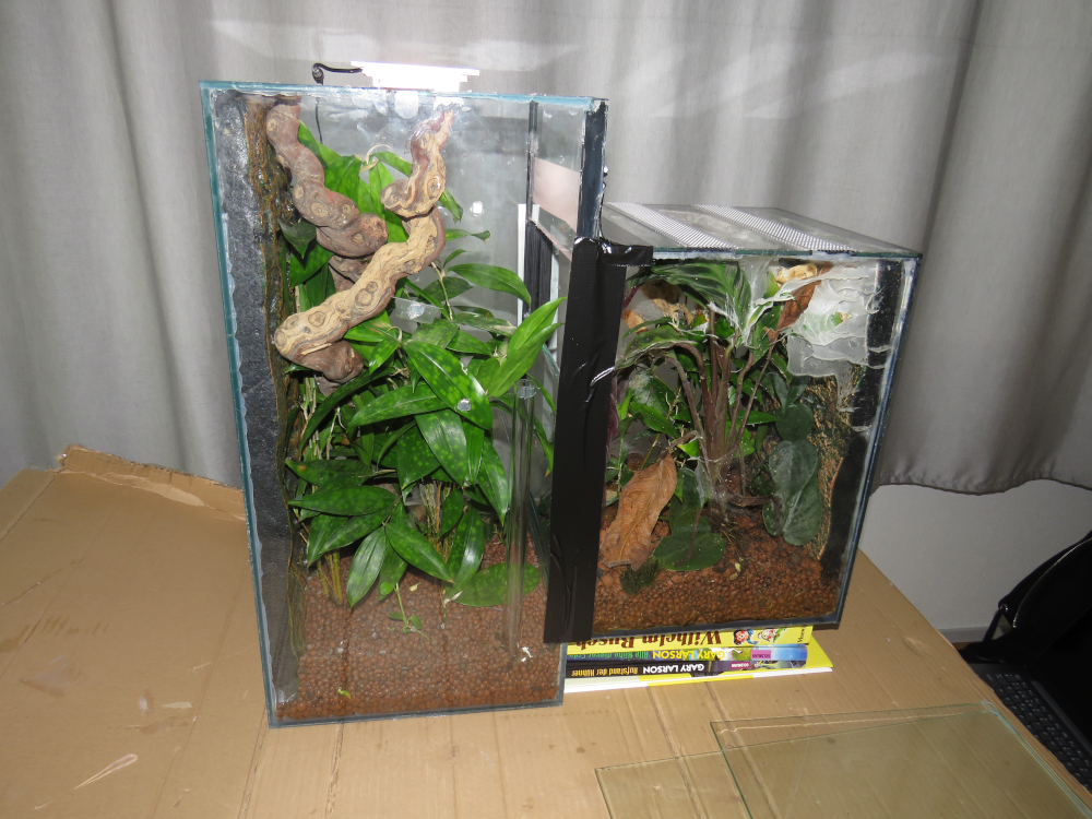 Die für den Umzug provisorisch zusammengefügten Terrarien.