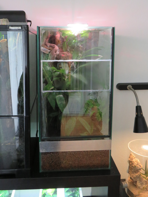 Die Anpassung mit der doppelten Frontscheibe hat sich bereits ausgezahlt. Die Ameisen belaufen im Normalfall hauptsächlich die Rückwand, die Pflanzen, die Seitenscheiben und den Deckel. Die kleine Aussparung bzw. das eigentliche Schiebeglas in der Mitte der Frontscheibe wir eher wenig frequentiert, was das Füttern und Hantieren in der Anlage deutlich erleichter. Nicht geändert hat sich übrigens das Verhalten der Ameisen in puncto Sauberkeit – es sind wirklich kleine Drecksspatzen und ich muss die Scheiben einmal wöchentlich von innen abwischen.
