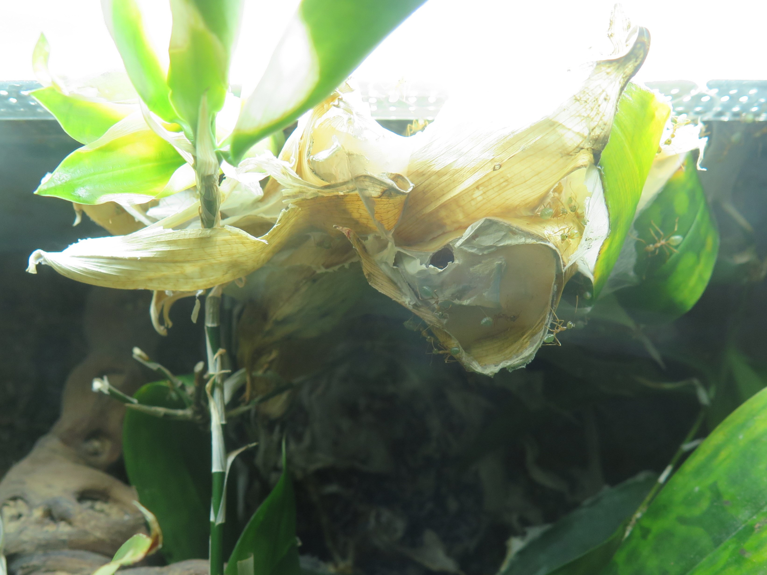 Die Ameisen konnten ihr Hauptnestest seit August deutlich erweitern. Mangels genügend verfügbarer Blätter wurde mit der Zeit ein regelrechter Seidnmantel um das eigentliche Planzennest herum erstellt. Der Bambus-Drachenbaums jedenfalls ist robust genug dem Treiben der Ameisen standzuhalten und im innern des Seidennestes kann man nochimmer grüne Blätter erkennen.