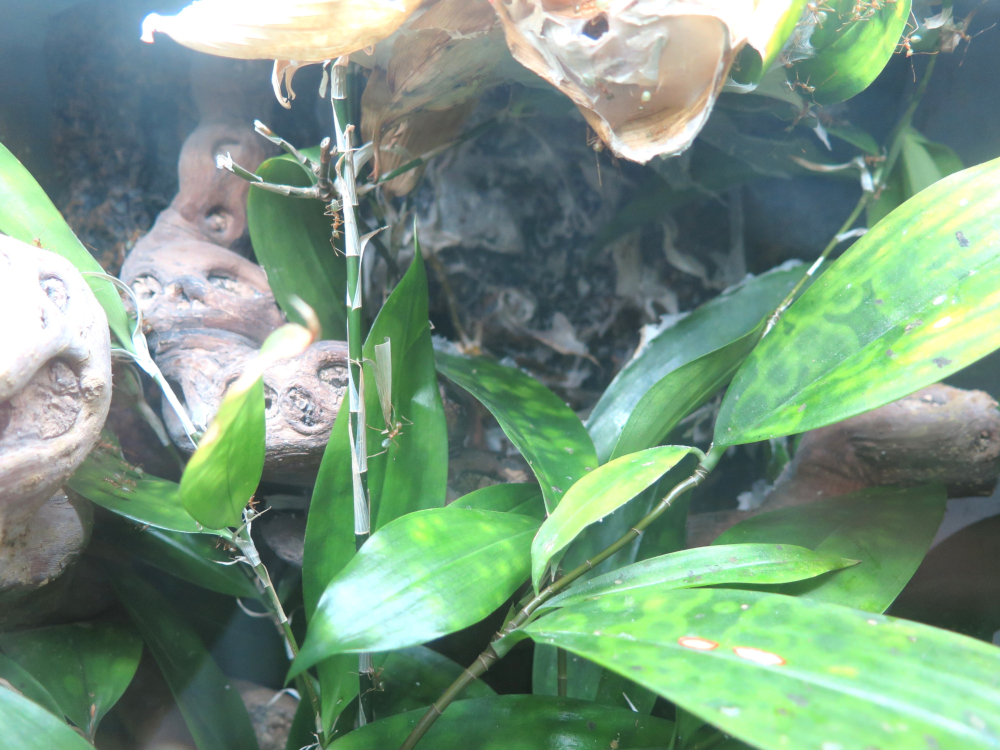Der Vorteil dabei ist, dass ich nun wieder Einblick in einzelne Bereiche der Nester habe. Es bleibt zu hoffen, dass die Pflanzen im oberen Bereich des Terrariums bald nachwachsen, denn das Nest an der Decke scheint ebenfalls nicht mehr allzu grün zu sein.