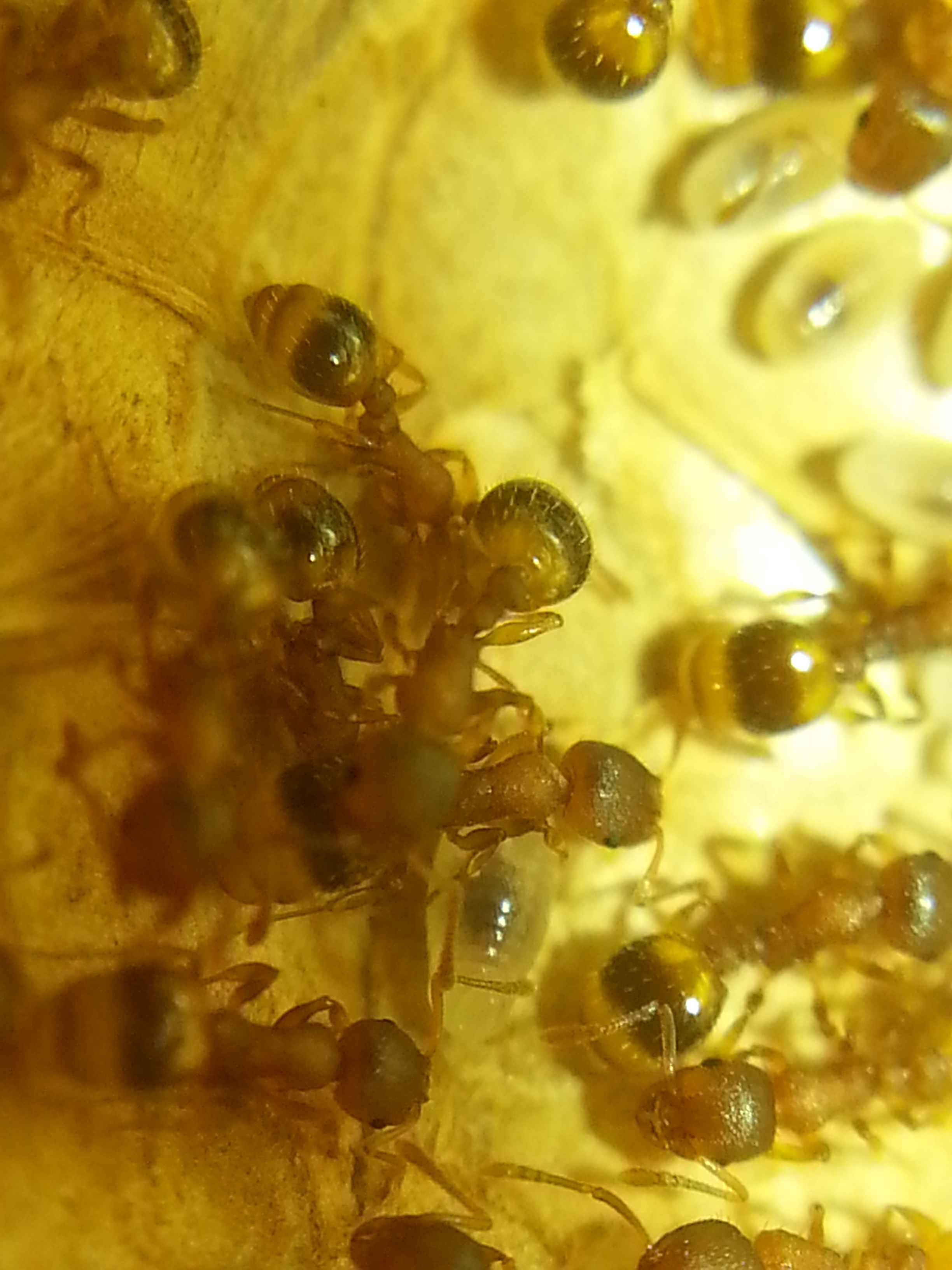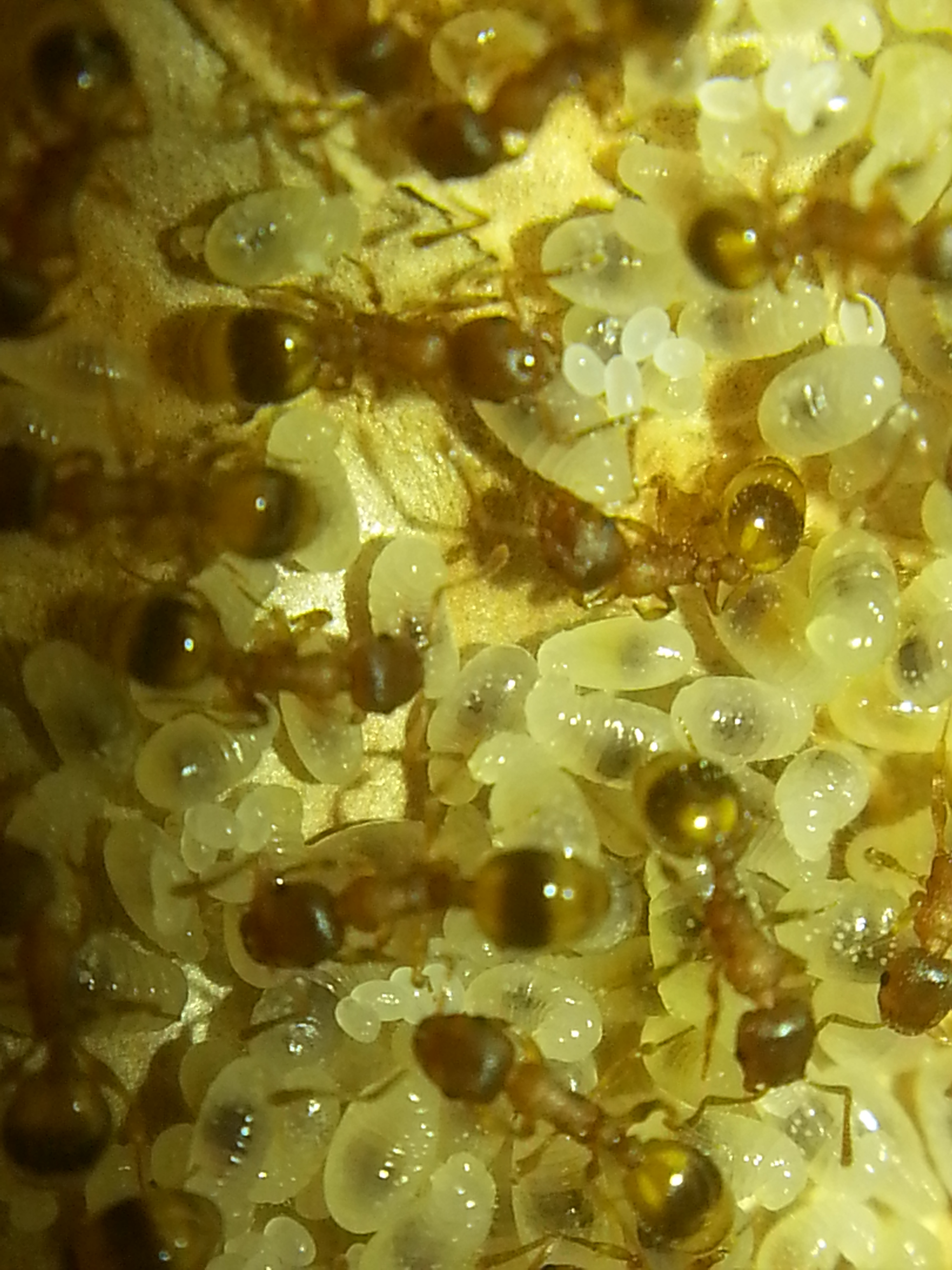 Zu Kolonie 1 : Da ich bis jetzt keine Königin ausfindig machen konnte (und ich habe sehr viele Fotos gemacht) gehe ich, wie schon geschrieben, von einer weisellosen Kolonie aus. Trotzdem sind im Herbst noch relativ viele Eier gelegt worden, die auch immer noch im Nest sind (trotz Einwinterung ende Oktober). Der Verdacht liegt also nahe, dass eine oder mehrere Arbeiterinnen die Eier gelegt haben. Definitiv erfahren werde ich das wohl erst, wenn die Eier sich zu männlichen Geschlechtstieren entwickeln. Eine Adoption würde sich anbieten, doch dazu ein ander mal mehr. Aber gerade deswegen die Bitte um Bestimmung.