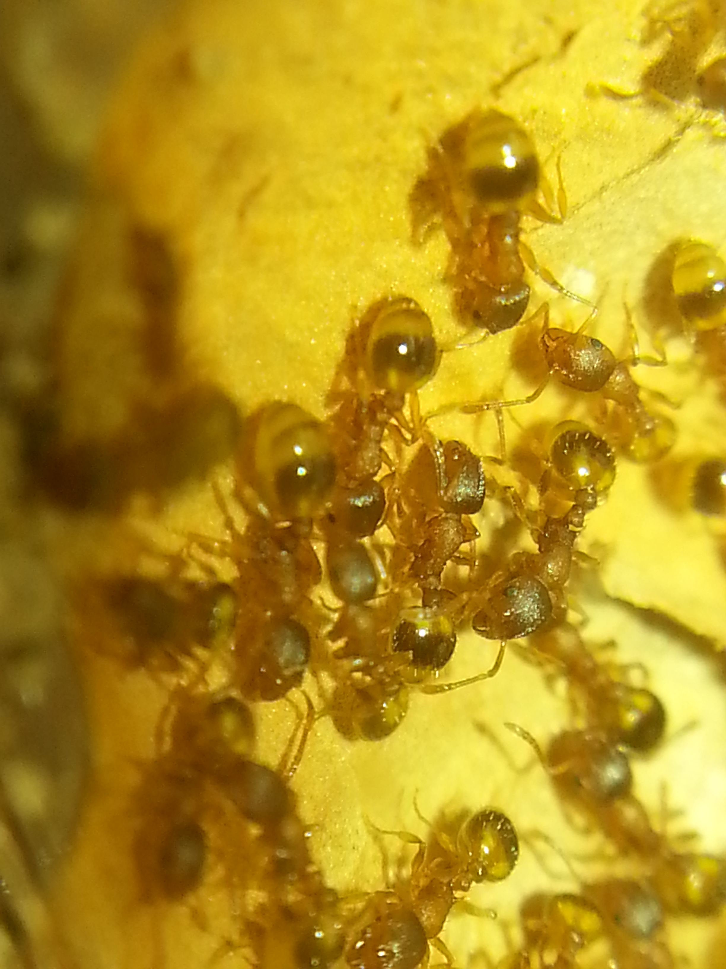 Ich habe im Moment mehrere Temnothorax Kolonien in der Winterruhe im Kühlschrank. Hier geht es speziell um zwei Kolonien : die eine ist ziemlich groß, lebt in einer Walnuss und hat sehr wahrscheinlich keine Königin. Die zweite spielt nur indirekt eine Rolle - nach ihrer Umsiedlung von der angebrochenen Eichel, in ihr neues Zuhause (im Moment eine halbe Haselnuss) fand ich insgesamt 3 Gynen (einmal zwei und das andere mal eine alleine) innerhalb des Formikariums, welche Krampfhaft versuchten zu entkommen.