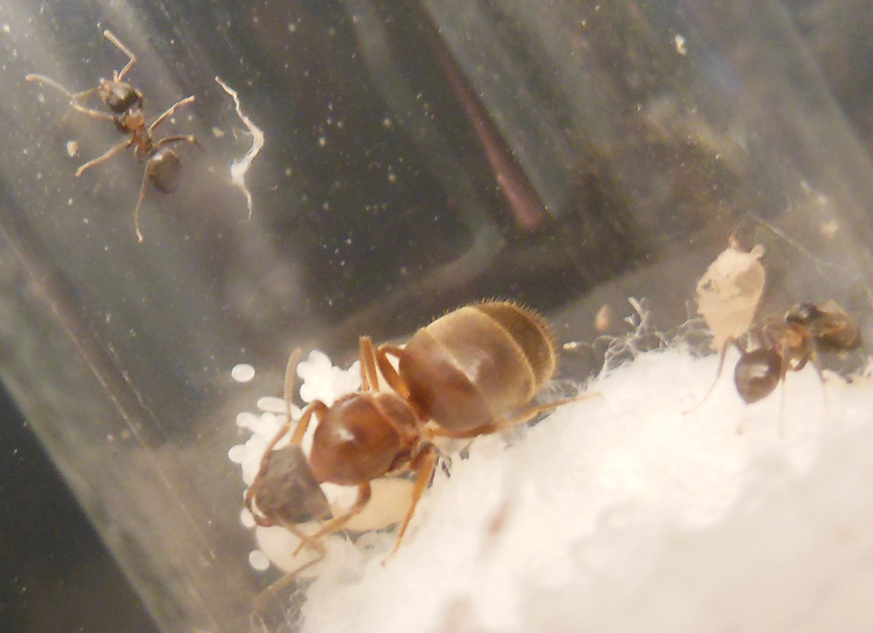 Rote unbekannte Königin deutliche orange-rotfärbung über den gesamten Körper, auf dem Foto noch recht gut zu erkennen. Im Vergleich zu den vermeindlichen Lasius cf niger ist die Königin identisch gross, die Pygmäen der unbekannten Art sind aber ca. 0.5 - 1 mm grösser.