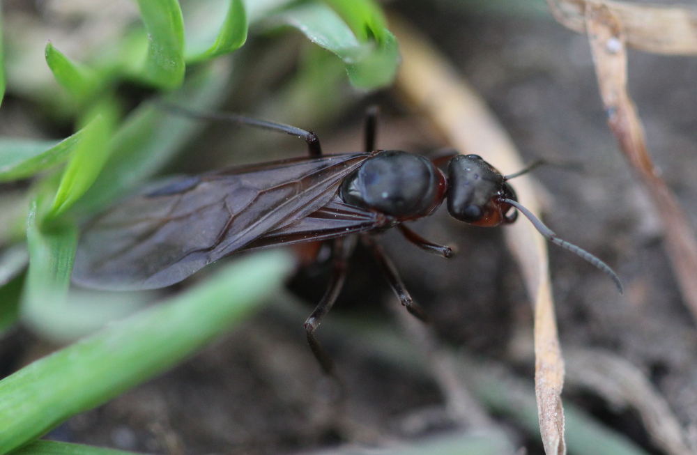 Mit einiger Vorsicht und soweit es die Bildqualität zulässt, kann man auf Formica polyctena od. F. rufa tippen. Wegen der erwiesenen Homoiothermie ist vor allem F. polyctena in der Lage, sehr früh mit der Aufzucht von Geschlechtstieren zu beginnen. Lt. Seifert findet das Schwärmen zw. 11. April und 22. Juni (S. 314) statt, F. rufa ist etwas später dran (20. April bis 10. Juli). Der recht gut zu erkennende schwarze Glanz auf der Gaster weist ebenfalls in diese Richtung. Damit wäre der Termin immer noch sehr früh, aber Temperaturen von über 20° können die Tiere aus dem Nest locken. Wäre noch die Frage zu klären, ob das Individuum tatsächlich abgeflogen ist oder sich nur am Boden vom Nest wegbewegt hat.