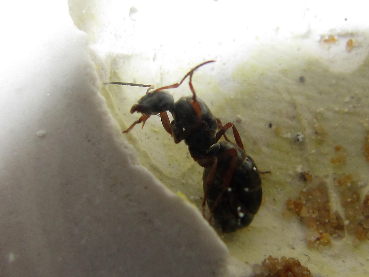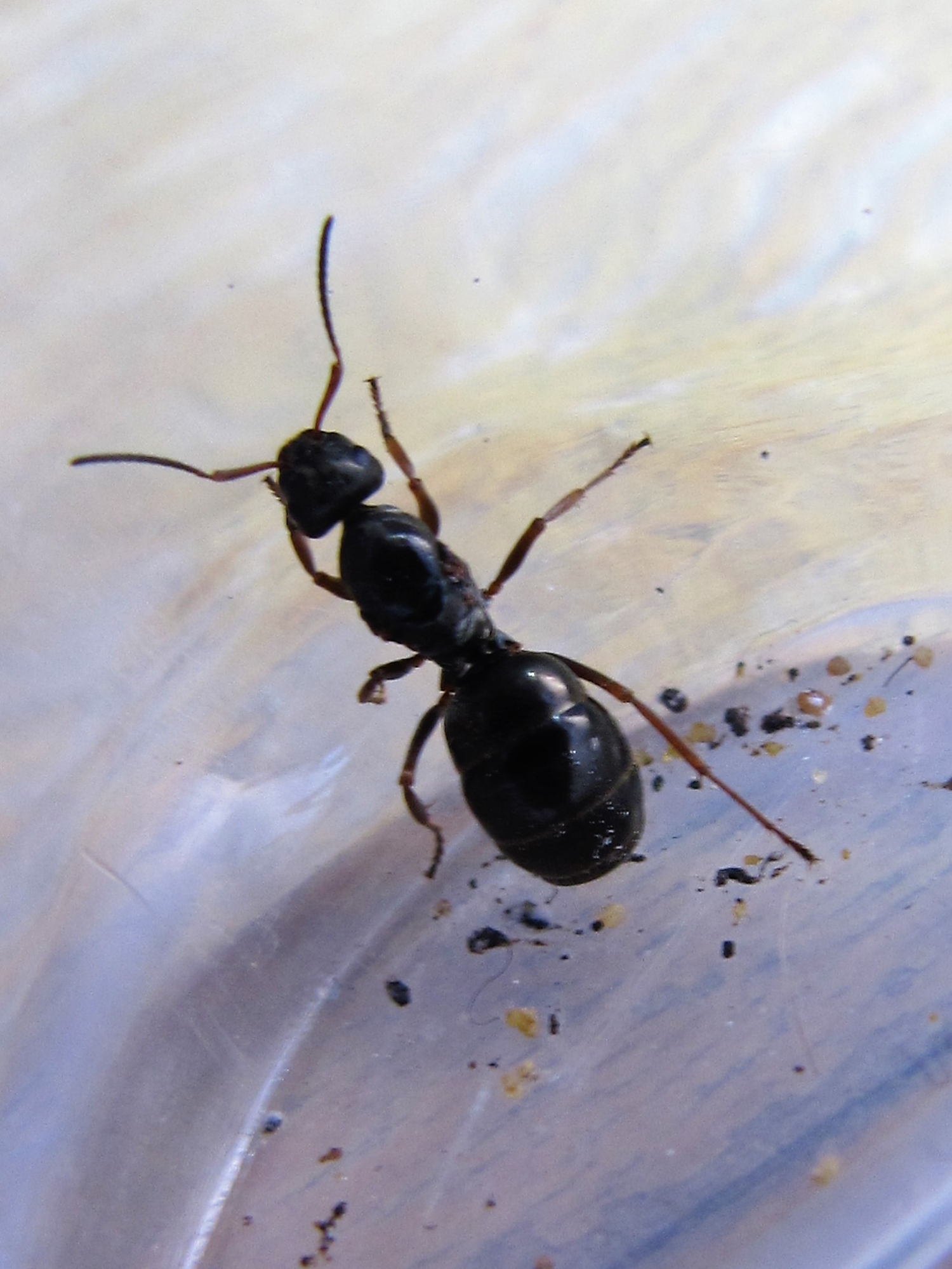 Sie ist 11 mm lang, schnell und wendig, sehr auffällig war der schwarze Glanz des Tieres im Sonnenlicht, er kommt auf meinen schlechten Bildern nicht zur Geltung, aber sowas ist mir bei Formica noch nie aufgefallen. Ihre Beine scheinen eher braunrötlich.