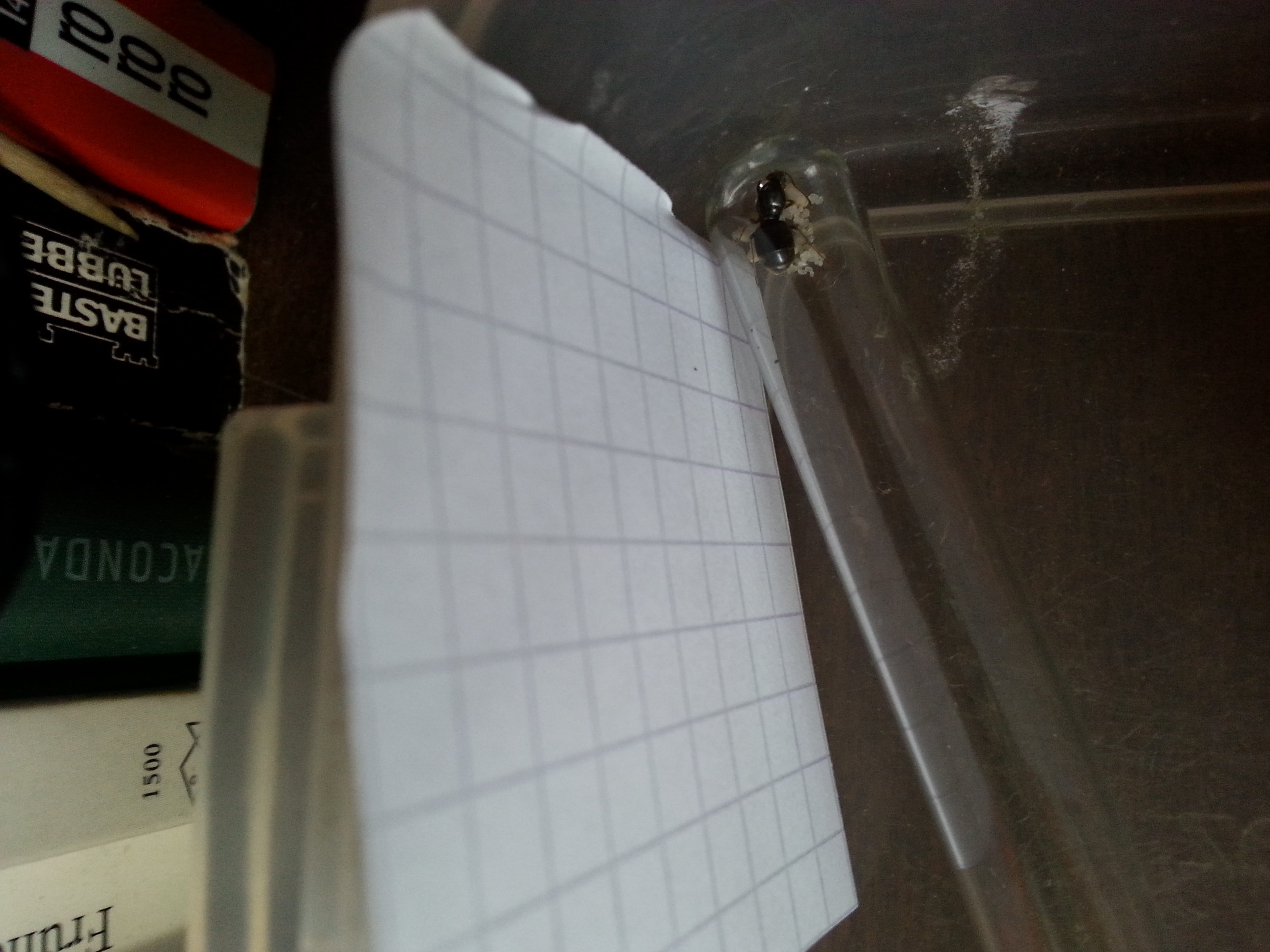 Das war das Behältnis mit der die Gyne eingefangen wurde. Ich habe ihr ein abgedunkeltes Reagenzglas mit Wassertank angeboten. Dieses Angebot hat das Fräulein leider ausgeschlagen, so dass ich jetzt täglich am Eingang einen Wattebausch befeuchte. Das Papier ist normales, kleinkariertes 5mm Karo. Zur Farbe kann ich wenig sagen, da ich eine Farbfehlsichtigkeit habe.