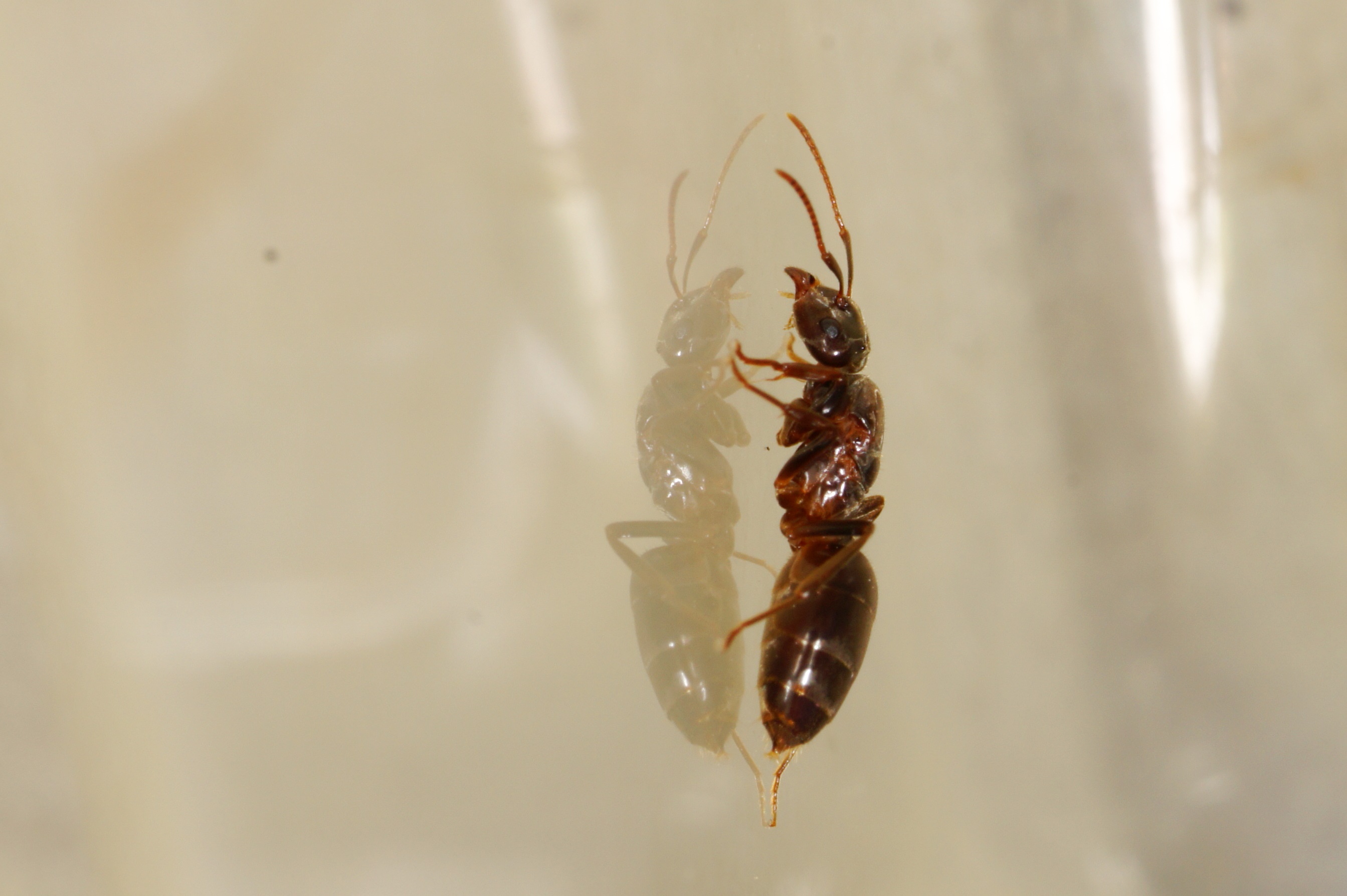 In solchen Fällen verlasse ich mich lieber auf relative Bestimmungsmerkmale, wie Nestbau, Aggressionsverhalten, Interaktion (intra- u. interspezifisch) usw.: SEIFERT (S. 282) erwähnt ausdrücklich die Eigenschaft dealater, begatteter Gynen im Zuge der Suche nach einem Wirtsnest eine Lasius-Arbeiterin im Vorfeld zu ergreifen, sie zu töten und sich mit deren oberflächlichen Duftstoffen "einzureiben". Die zerbissene Arbeiterin wird dann noch eine Zeit lang herumgetragen. Diese Strategie wird das Eindringen in das Wirtsnest der getöteten Arbeiterin sicher erleichtern.