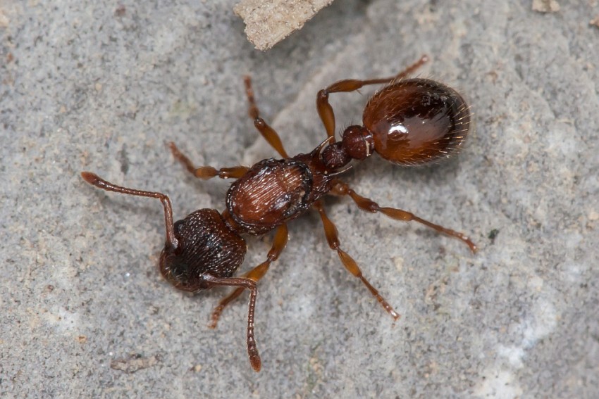 hier hätte ich mal wieder eine Ameise, die sich über einen Namen freuen würde. Im Moment heißt sie Myrmica sp. - wenn das falsch ist, taufe ich sie gerne um. Gefunden habe ich sie unter einem Stein am Hang eines (überwiegend) Nadelwaldes (Fichte + Kiefer), der in eine Streuobstwiese überging. Leider habe ich nur dieses eine Foto...