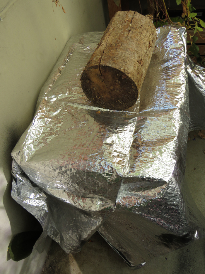 Die Rettungsdecke reflektiert das Sonnenlicht und verhindert so, dass sich die Kiste bei langer, direkter Sonneneinstrahlung schnell aufwärmt.