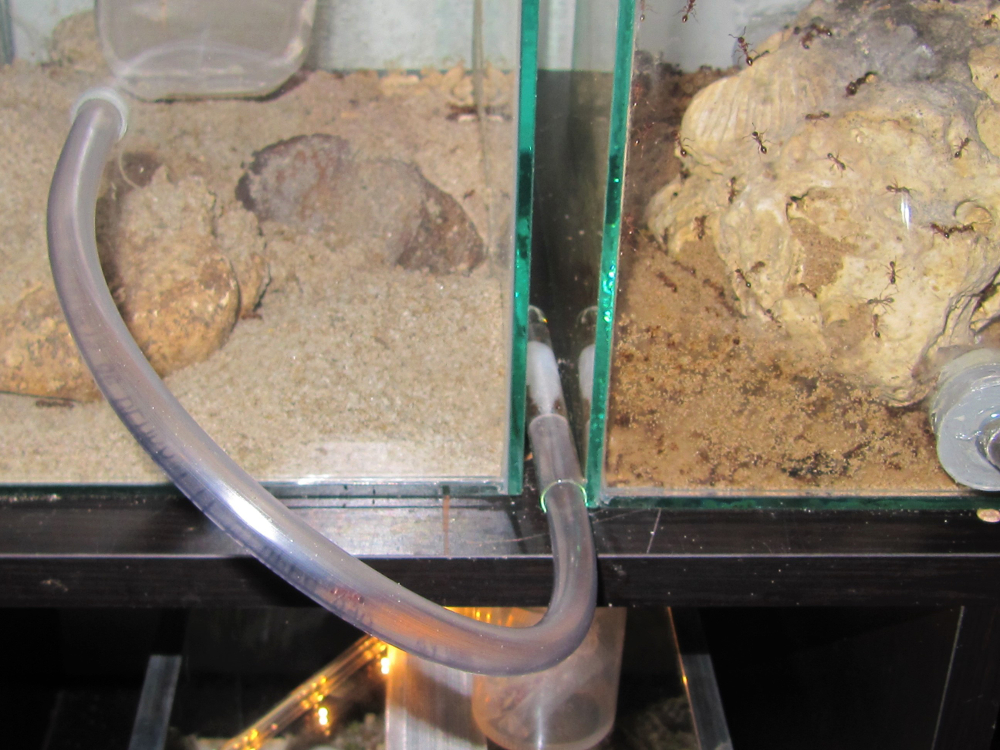 Wenn man mehrere Formicarien hat, kann man sie leeren, wenn man sie abkoppelt und Reagenzgläser mit Wassertanks hineinlegt. Oder diese an einen Verbindungsschlauch anbringt. Die Arbeiterinnen, die sich im Reagenzglas sammeln, kann man dann in die Arena schütten, die noch mit dem Nest verbunden ist.