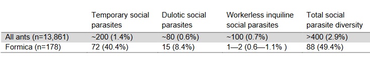 Table 1: Diversity of social parasites in the genusFormica compared to all other ants. Socially parasitic life histories are significantly overrepresented in Formica ants, except for inquilinism. The total social parasite diversity in ants is higher than the sum of species in individual life history categories because the biology of numerous social parasites remains unknown. The data are derived from published sources (Hölldobler and Wilson, 1990; Buschinger,2009; Bolton,2020; Rabeling, 2020).