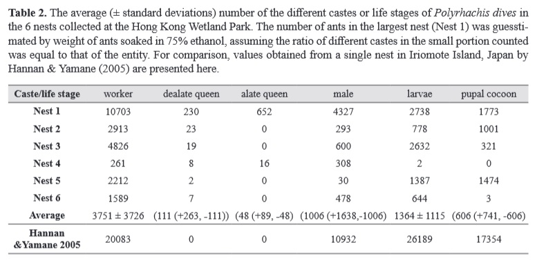 Anmerkung: Ob die z.T. sehr hohen Zahlen entflügelter Königinnen alle begattet und auch fertil sind, wurde wohl nicht untersucht. Weshalb bei dem einen ausgezählten Volk von Hannan & Yamane keine Gynen angegeben sind, ist evtl. aus deren Veröffentlichung von 2005 zu entnehmen.