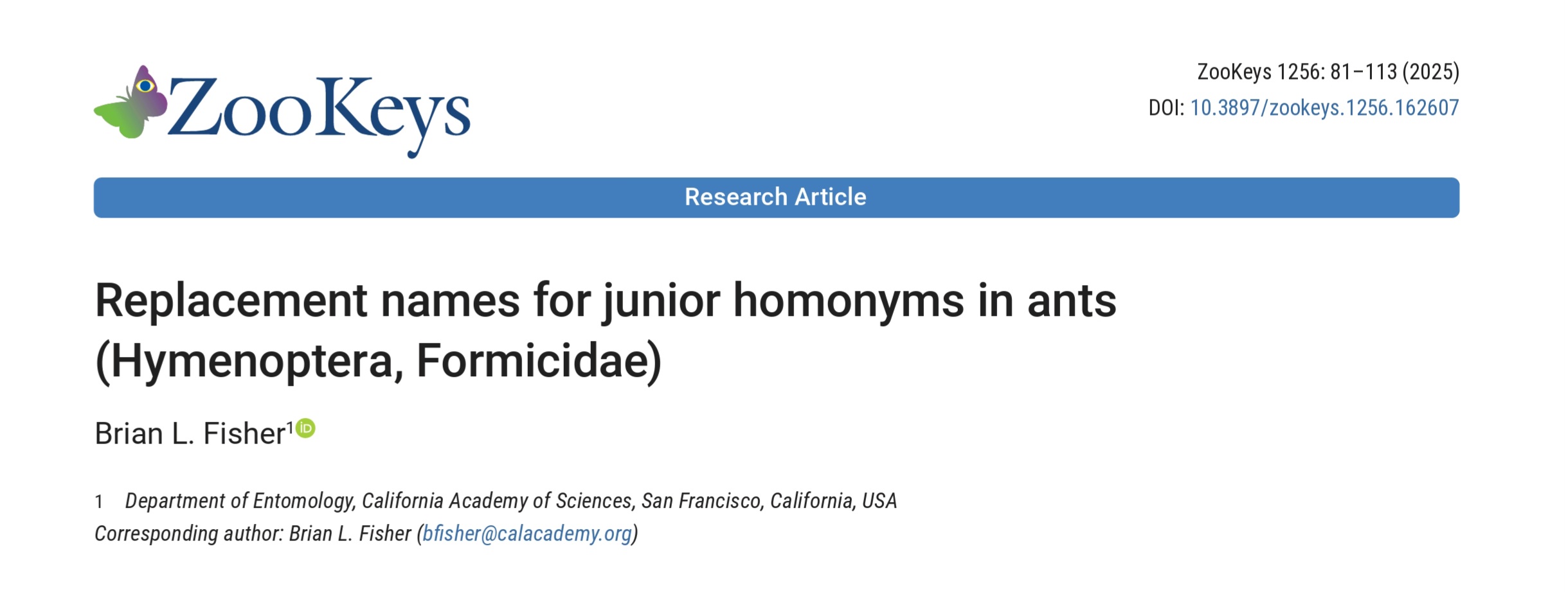 Neue Namen für teils altbekannte Ameisenarten: Replacement names for junior homonyms in ants (Hymenoptera, Formicidae). Brian L. Fisher, 2025.