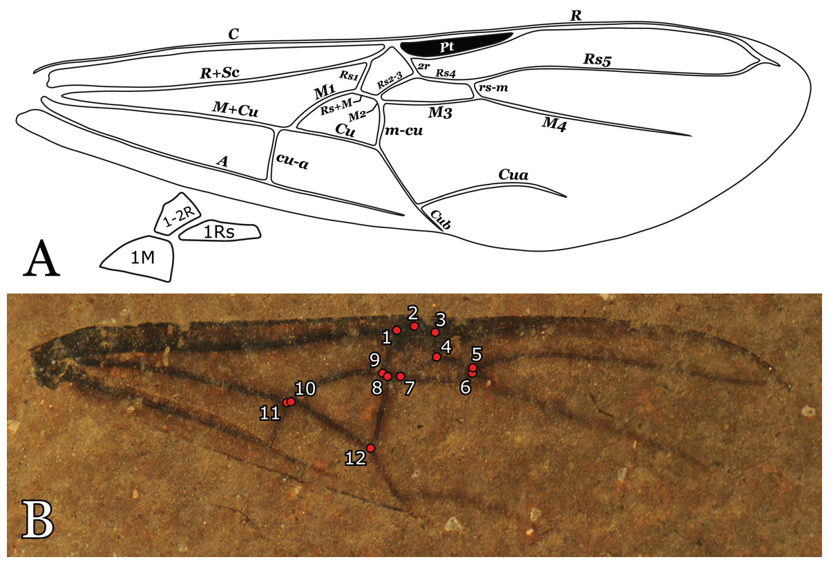 Fig.1 aus der Arbeit: Flügeladerung von Titanomyrma, und die darin festgelegten Messpunkte.