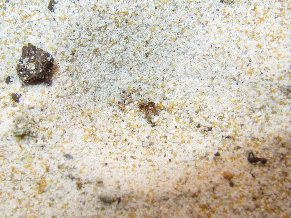 Ameisenlöwen sind auch schon wieder aktiv. Für das Foto habe ich etwas nachgeholfen, das kleine "Untier" hat brav mitgeholfen, die Lasius cf. niger hatte keine Chance.