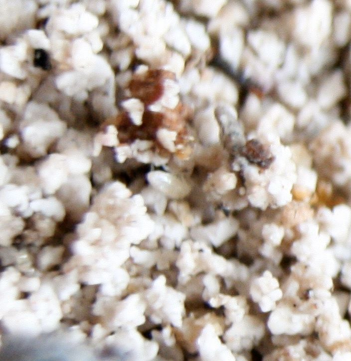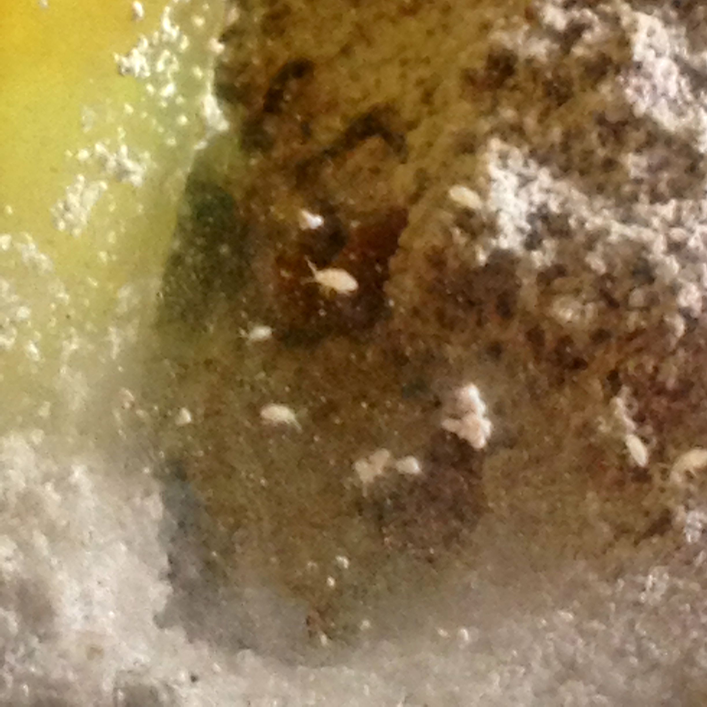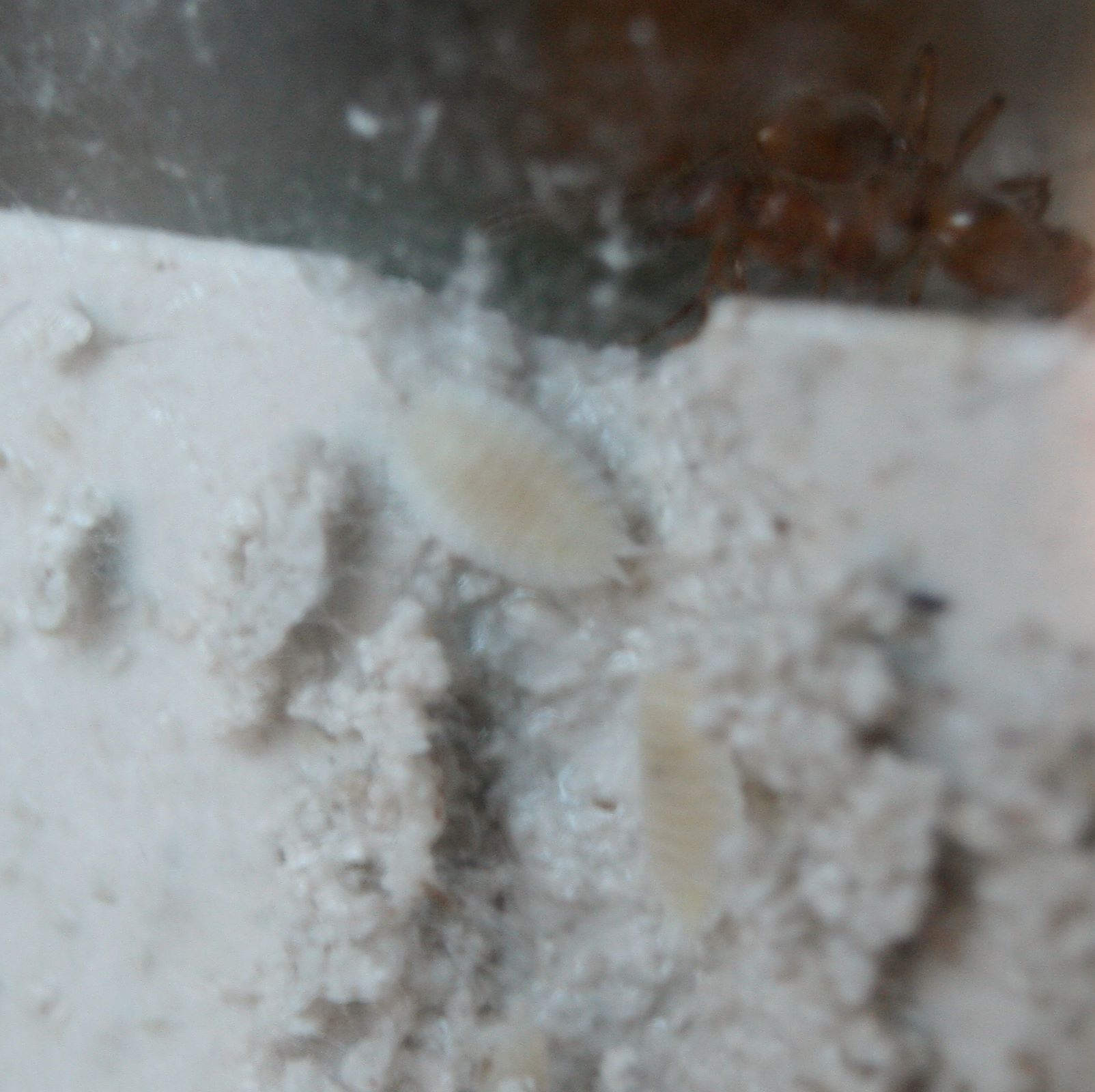 (Futter-)Milben, bewegen sich in der Regel langsam fort und wirken oft rundlich. Klein, häufig um die 0,5mm. Kopf kaum zu erkennen. Achtbeinig, da Spinnentiere. Klein, oft mit Lupe/Mikroskop erkennbare Borsten an den Beinen und Körper. Moder- und Hausmilben sind oft farblos bis weiss. Es gibt aber auch düklere Arten.Am Futter treten sie oft massenweise auf, bedecken es. Es scheint als sitzen sie still darauf, keine Konkurrenz erkennbar. Beit Trockenheit auch massenweise an Deckel entlang (im Kreis) laufend.