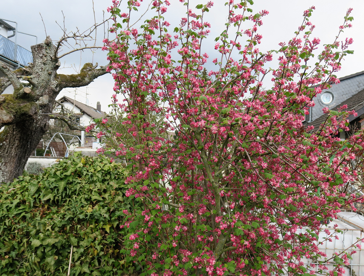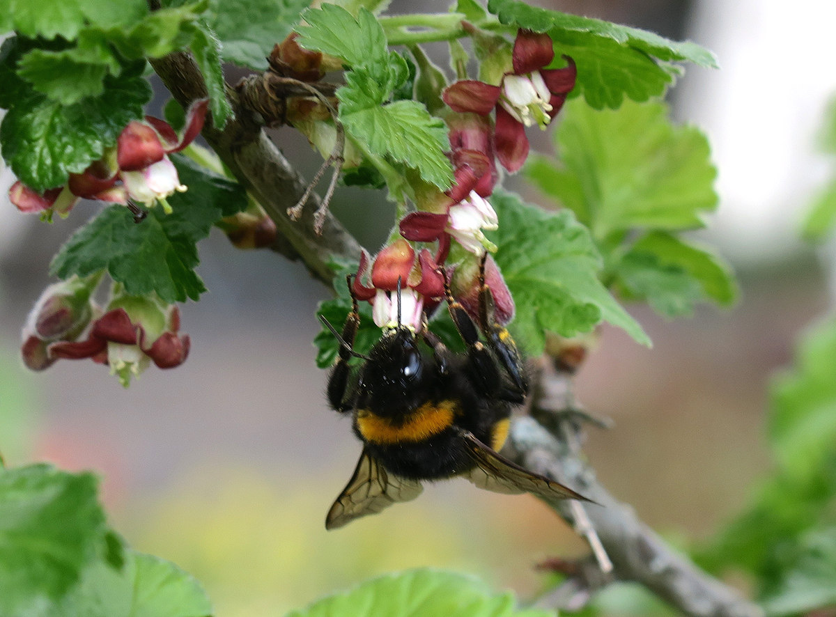 Eine weitere ausgesprochene Hummelpflanze ist die „Blut-Johannisbeere“, eine in vielen Varianten erhältliche Zierpflanze. Ihre Beeren sind nicht genießbar,