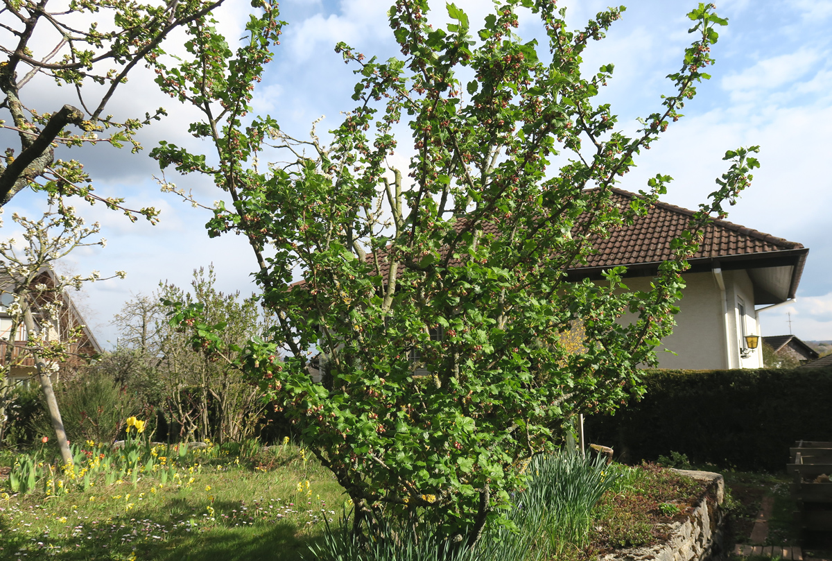 Der Strauch ist inzwischen knapp zwei Meter hoch und trägt alljährlich so viel, dass es für 2 Personen reichlich Marmelade bzw. Gelee gibt!