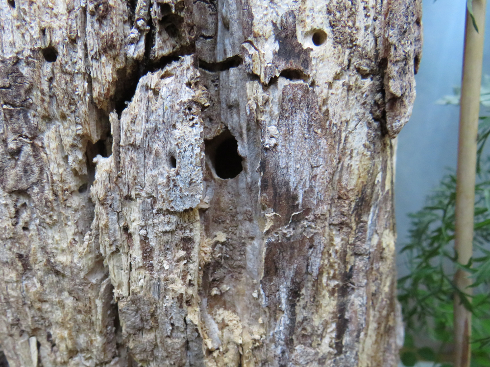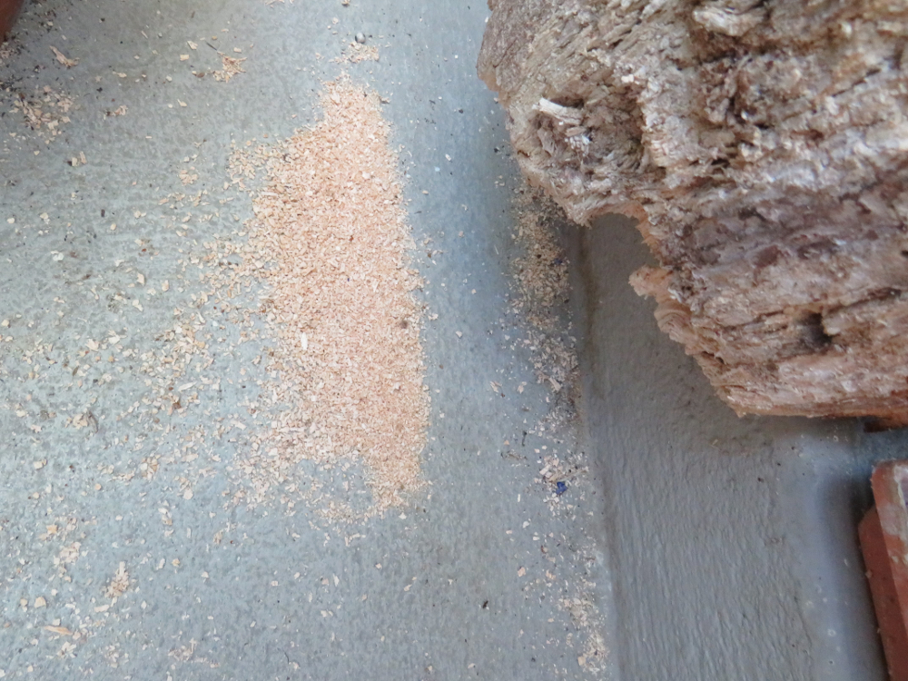 Auch aus anderen unbewohnten Röhren wird Material entnommen: Der Teil einer Puppenhülle, z. T. kleine Holzsplitter und alter Mörtel wird vermutlich mit dem Speichel vermischt