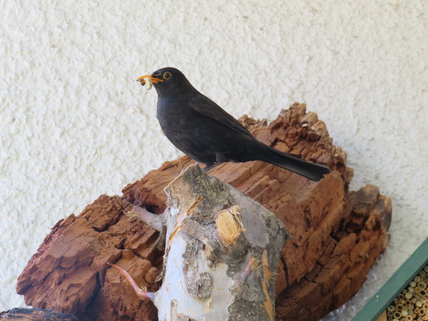 Und noch ein weiterer, unerwarterter Gast besucht regelmässig meine Wildbienennisthilfe. Ein Amselmännchen kommt seit drei Tagen mehrmals täglich vorbei.