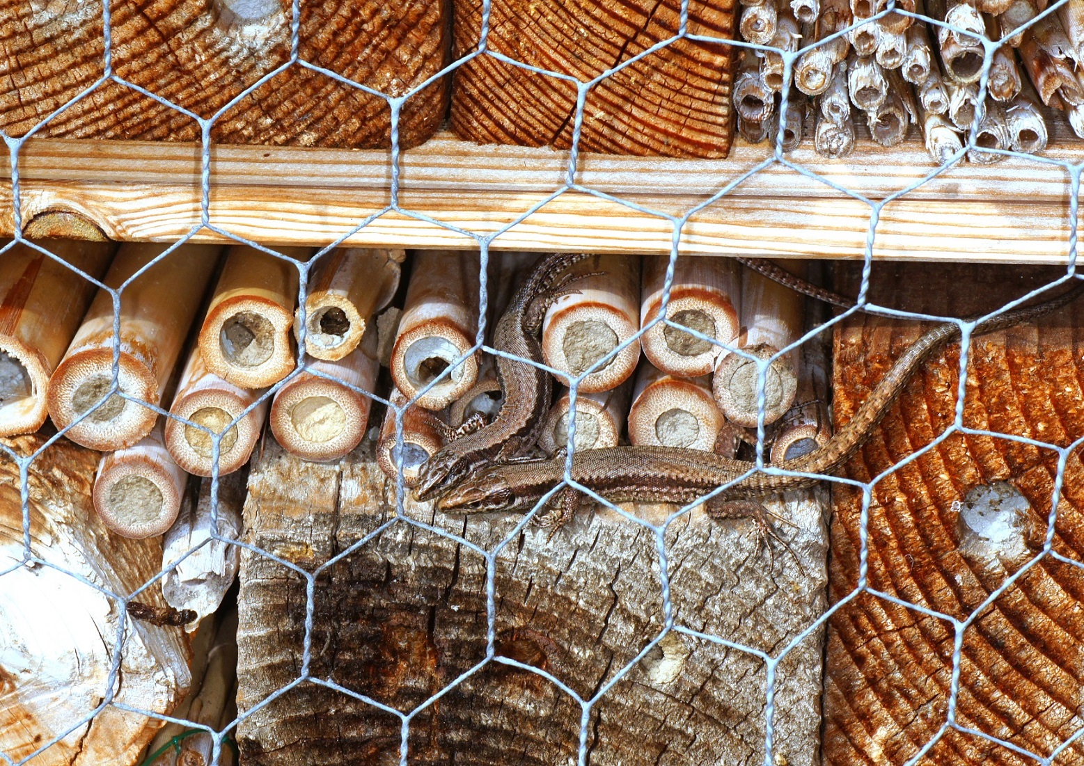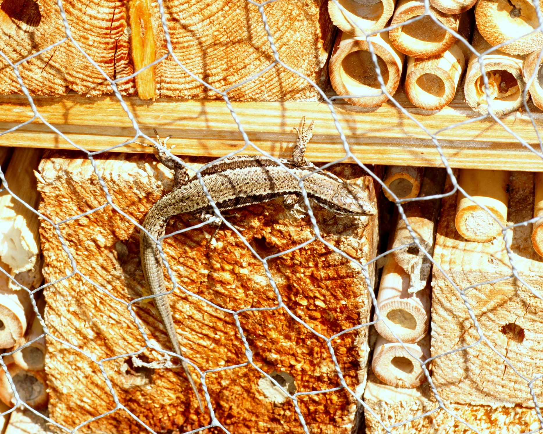 Heute: Stark bewölkt, hin und wieder Sonne, nur 15°C. Allein im Insektenhotel sonnen sich 3 Eidechsen: